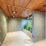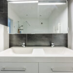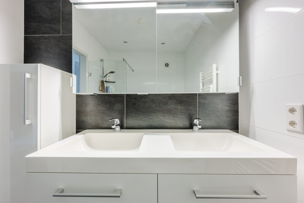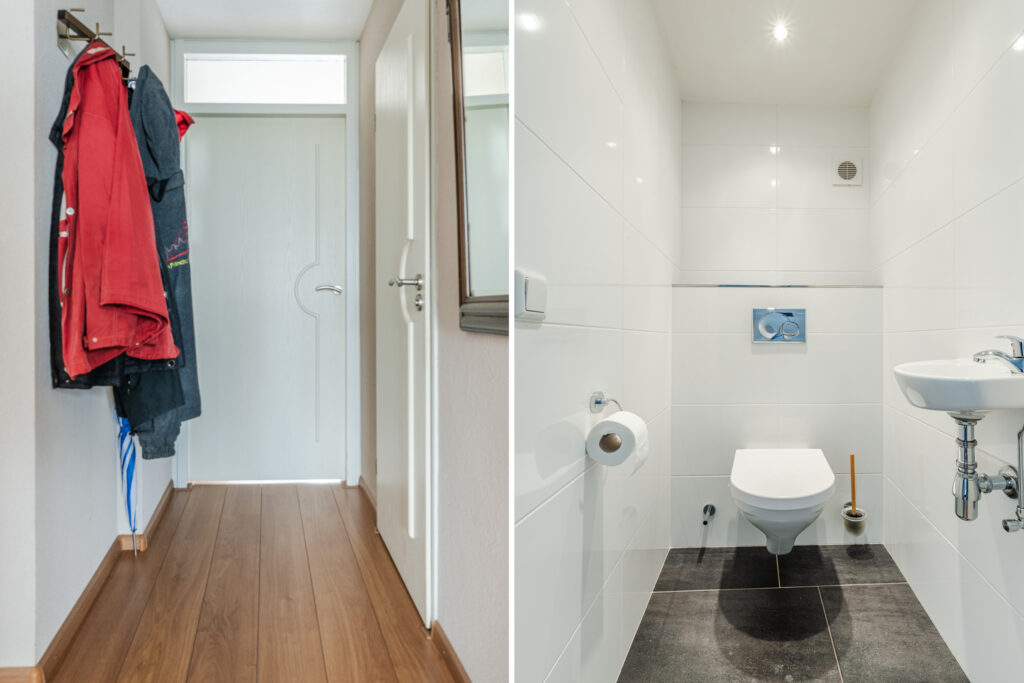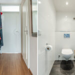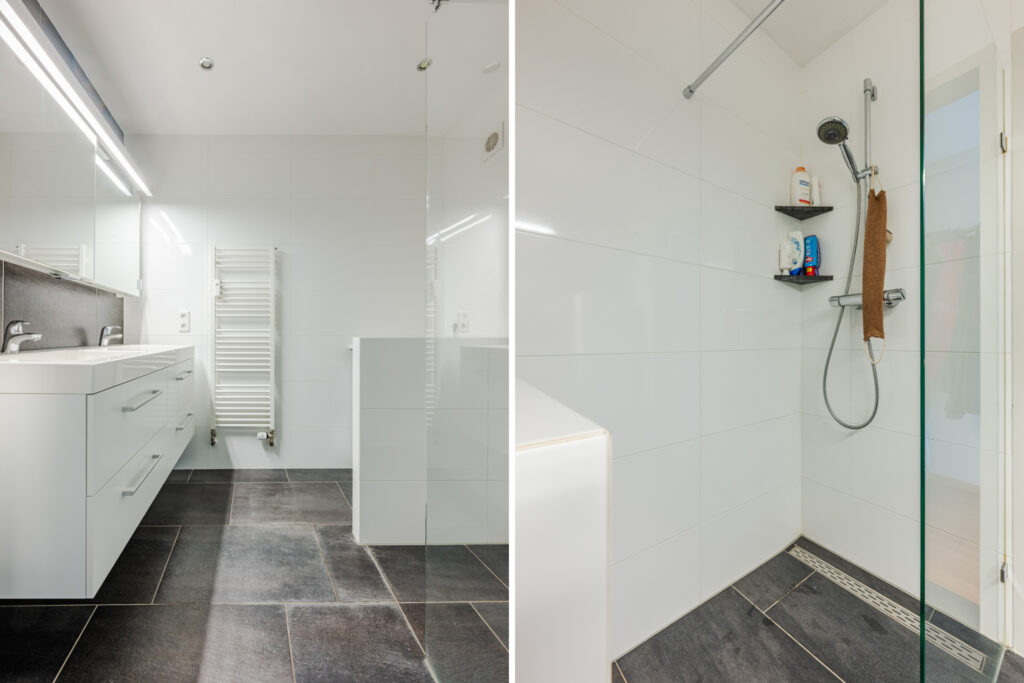 De moderne badkamer is luxe afgewerkt en voorzien van een inloopdouche met glazen wand en een fraai badkamermeubel met dubbele wastafel. Achter een halfhoge scheidingsmuur is ruimte voor de wasmachine en droger, keurig uit het zicht geplaatst. De separate toiletruimte is in dezelfde stijl afgewerkt en beschikt over een wandcloset en fonteintje.