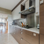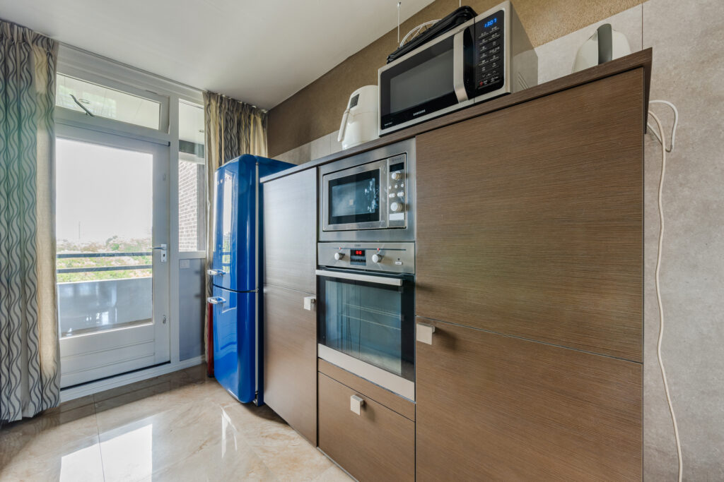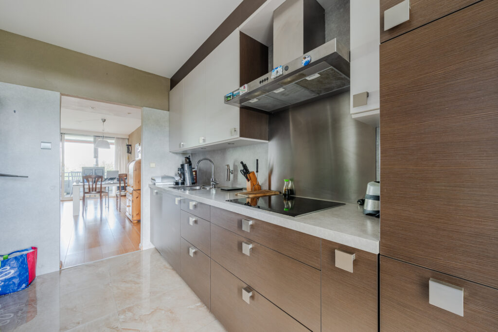 De keuken is aan de andere zijde van het appartement gesitueerd, in een praktische dubbele moderne wandopstelling. Deze is voorzien van diverse onder- en bovenkasten, laden en inbouwapparatuur: een elektrische kookplaat, afzuigkap, oven, magnetron, vaatwasser en een koelkast. Via een loopdeur bereikt u het tweede balkon, gelegen aan de oostzijde.
