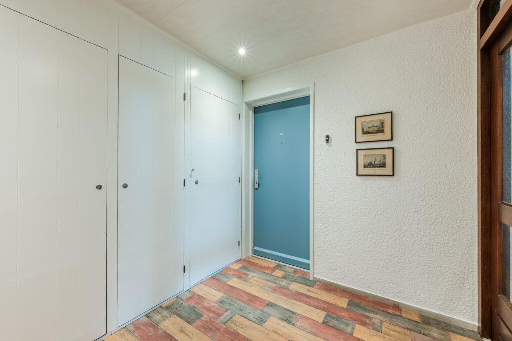 Via het portiek, wat gedeeld wordt met slechts 1 appartement, aan de binnenzijde van het gebouw betreedt u het appartement. In de hal vindt u de meterkast, een garderobehoek en een nette laminaatvloer, die is doorgelegd in de gehele woning (inclusief woonkamer en slaapkamers).