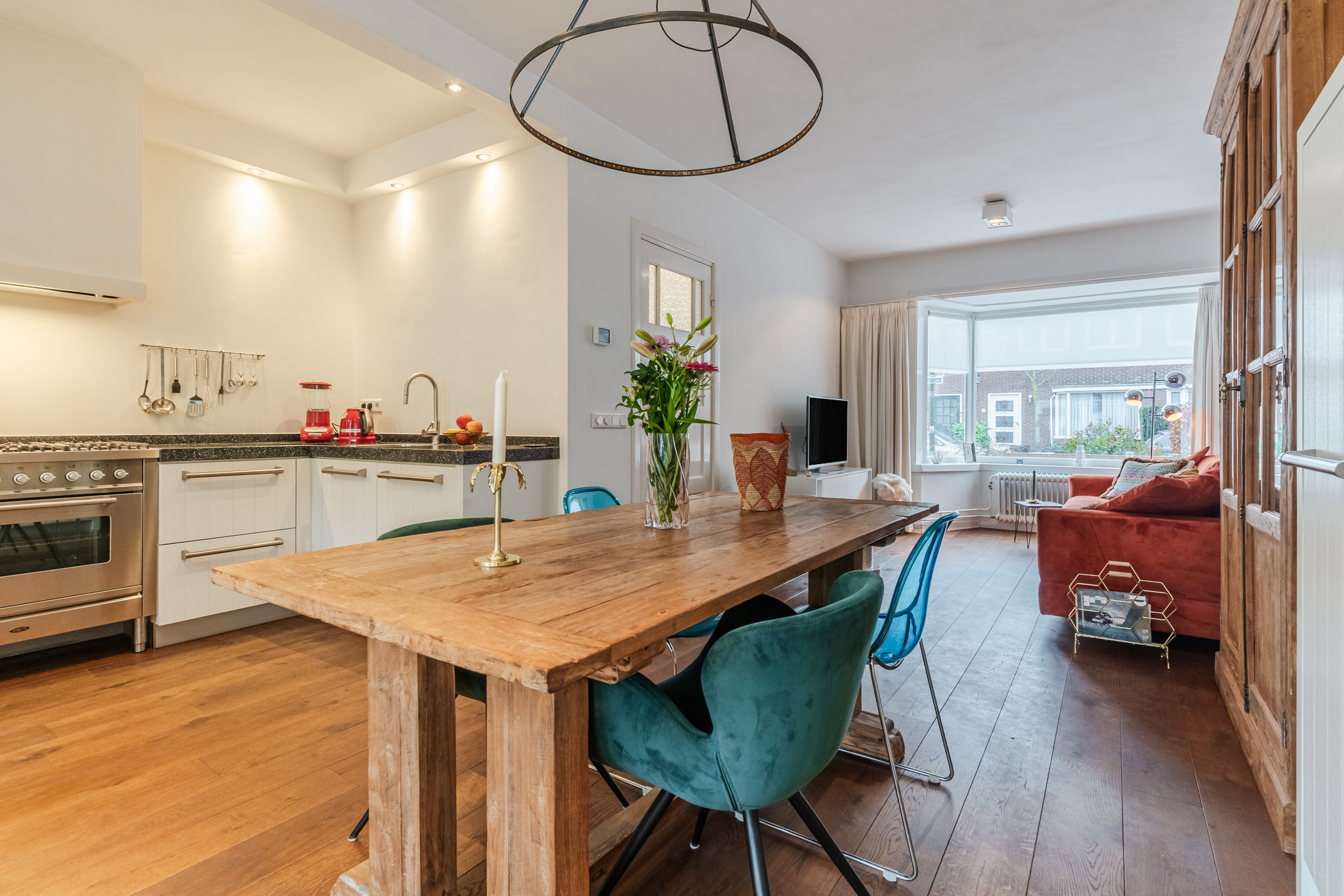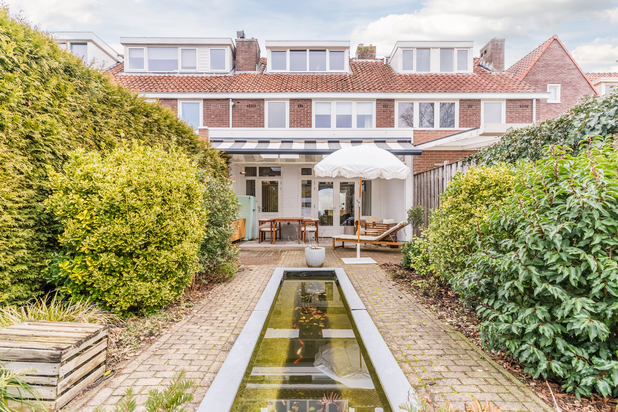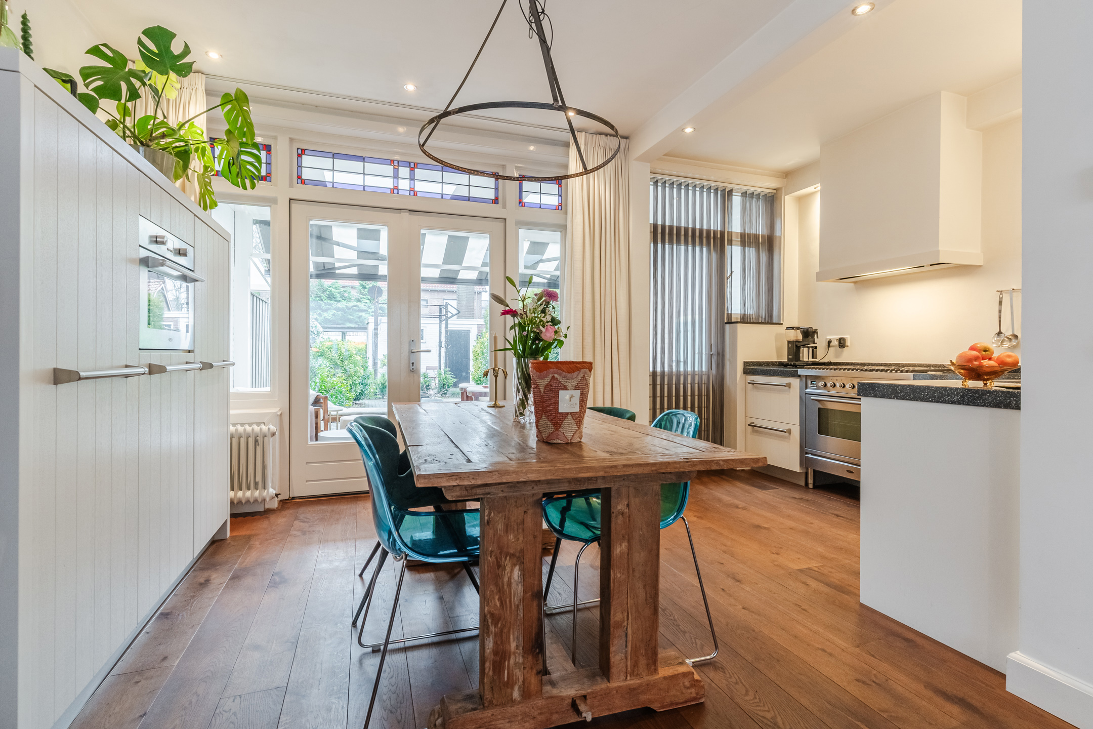 De keurig aangelegde voortuin zorgt voor een fraai aanzicht. Entree van de woning door middel van een markante voordeur. In de hal is de authentieke travertinvloer bewaard gebleven. Onder de trapopgang is een praktische bergkast gerealiseerd voor extra opslag mogelijkheden. Naast deze ruimte is een verzorgde toiletruimte gelegen. De sfeervolle woonkamer met een erker en een warme houten vloer is aan de voorzijde van de woning gelegen. De woonkeuken is aan de achterzijde gelegen en is voorzien een keurig keukenmeubel in hoekopstelling met een extra wandopstelling. Het keukenmeubel bestaat uit diverse kasten, laden en apparatuur: een brede “Boretti” oven met daarboven een 6-pits gasfornuis met wokbrander, afzuigkap, vaatwasser, combi-oven/magnetron, vriezer en koelkast. Vanuit de keuken door middel van openslaande deuren de achtertuin te bereiken. De luxe overkapping (2024) is met hoogwaardige materialen afgewerkt en voorzien van lichtkoepels, spotjes en is er een zonneluifel voor de nodige schaduw in de achtertuin. Deze overkapping biedt de ideale plek om al vroeg in het jaar van de zon te kunnen genieten of de zomeravonden heerlijk te verlengen! De diepe en privacy biedende achtertuin van circa 18 meter is gelegen op het zonnige zuidwesten. De tuin is keurig aangelegd met verschillende plantenborders met veel groen een waterpartij. Achterin de tuin bevindt zich de fietsenberging en een poort voor de achterom.