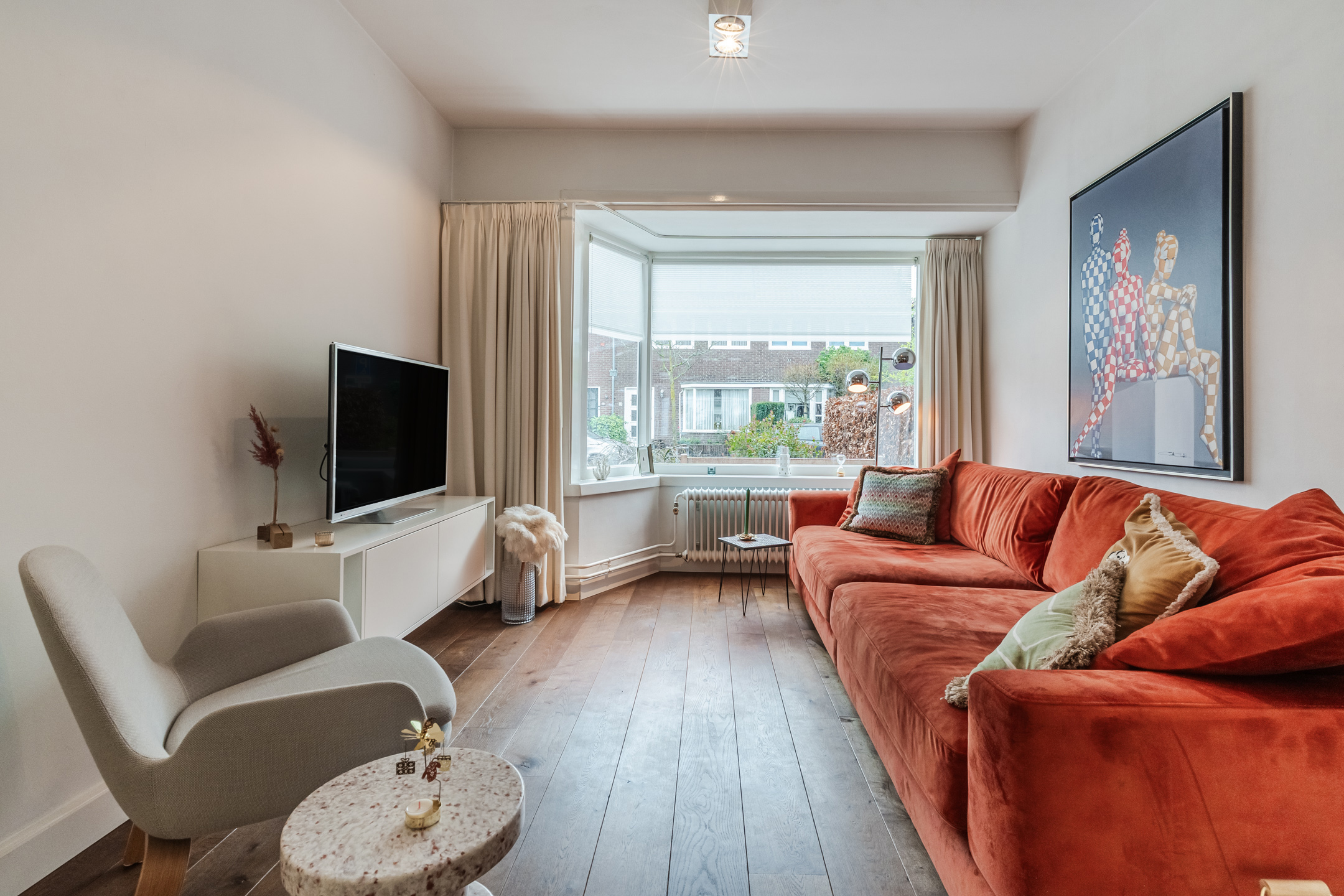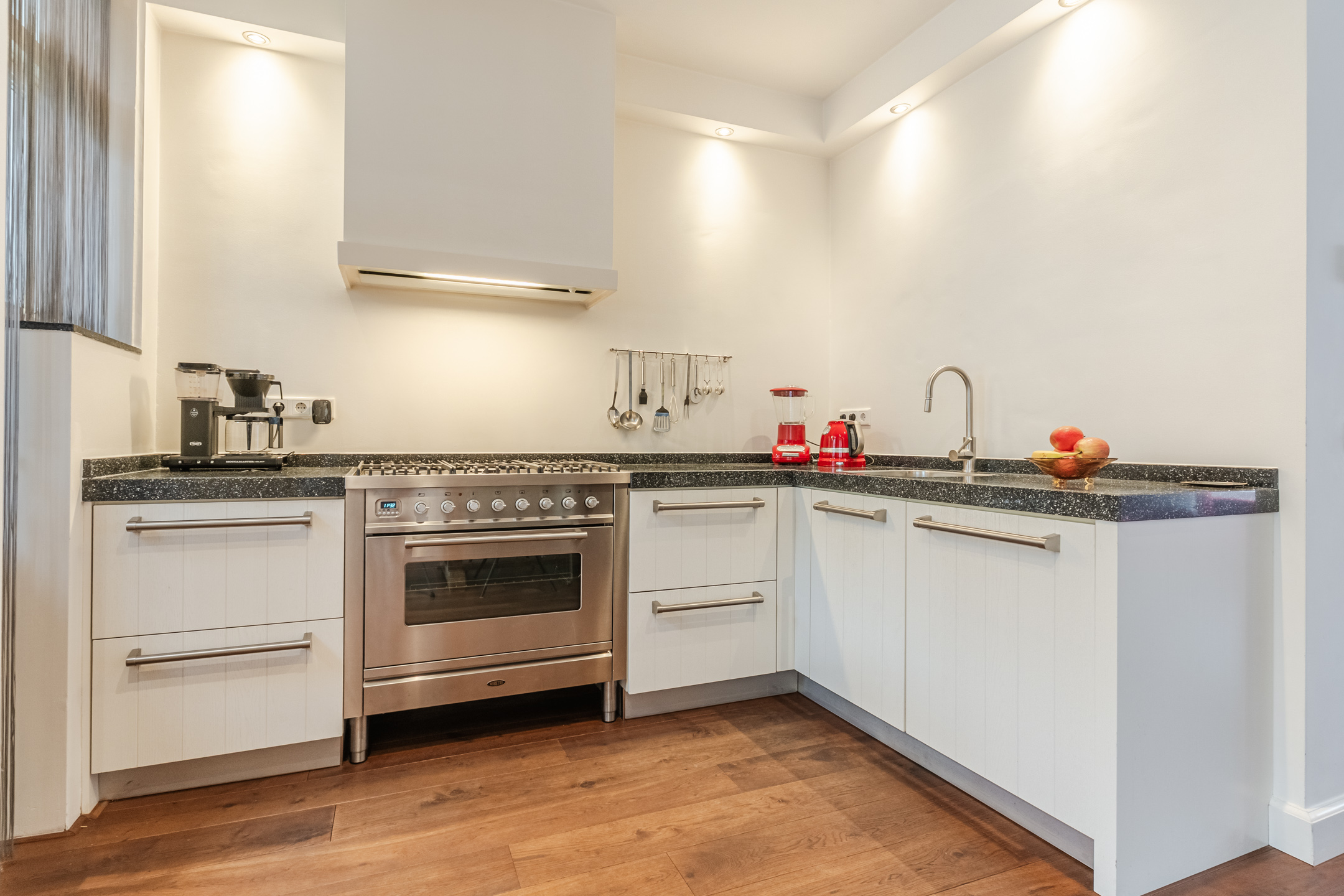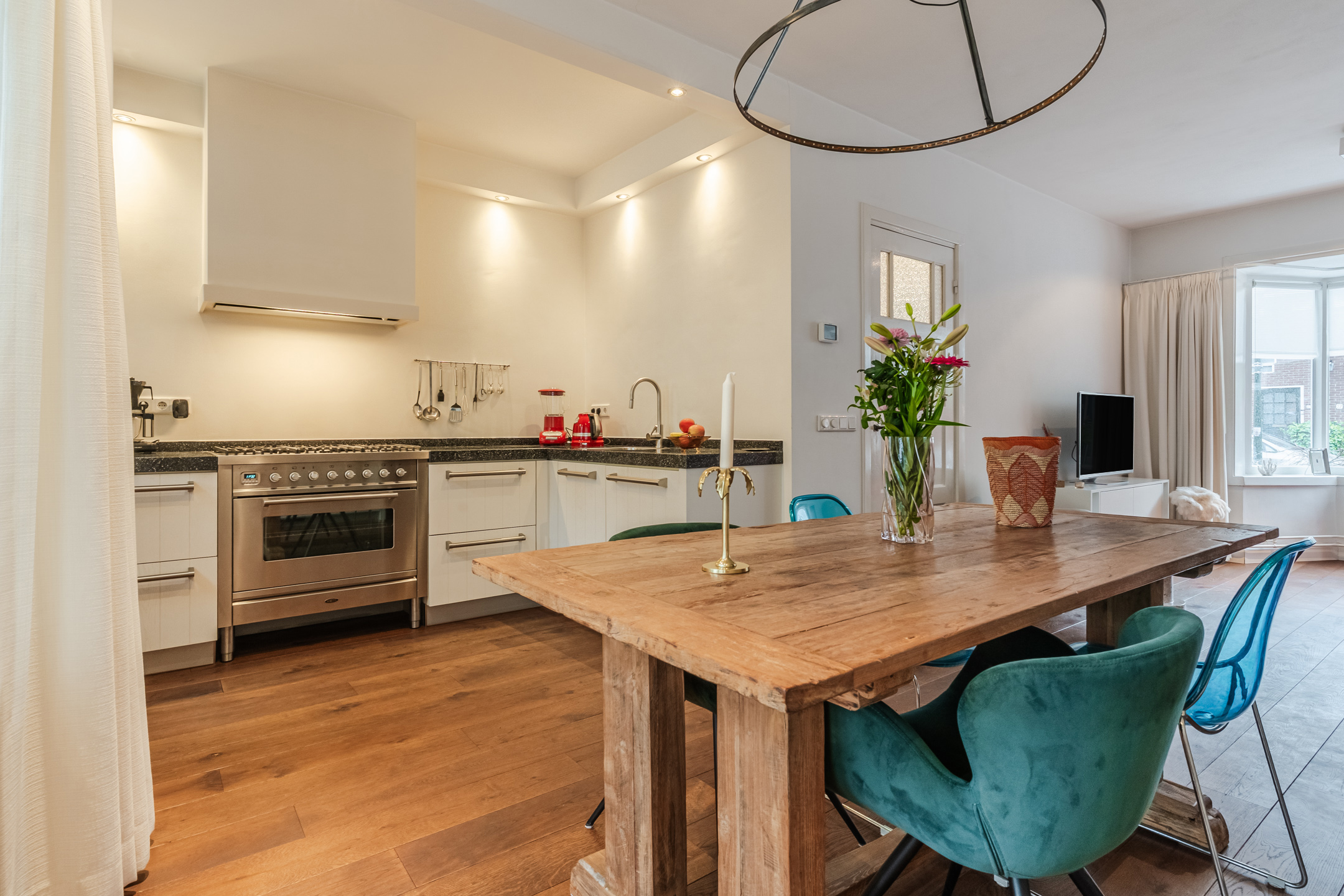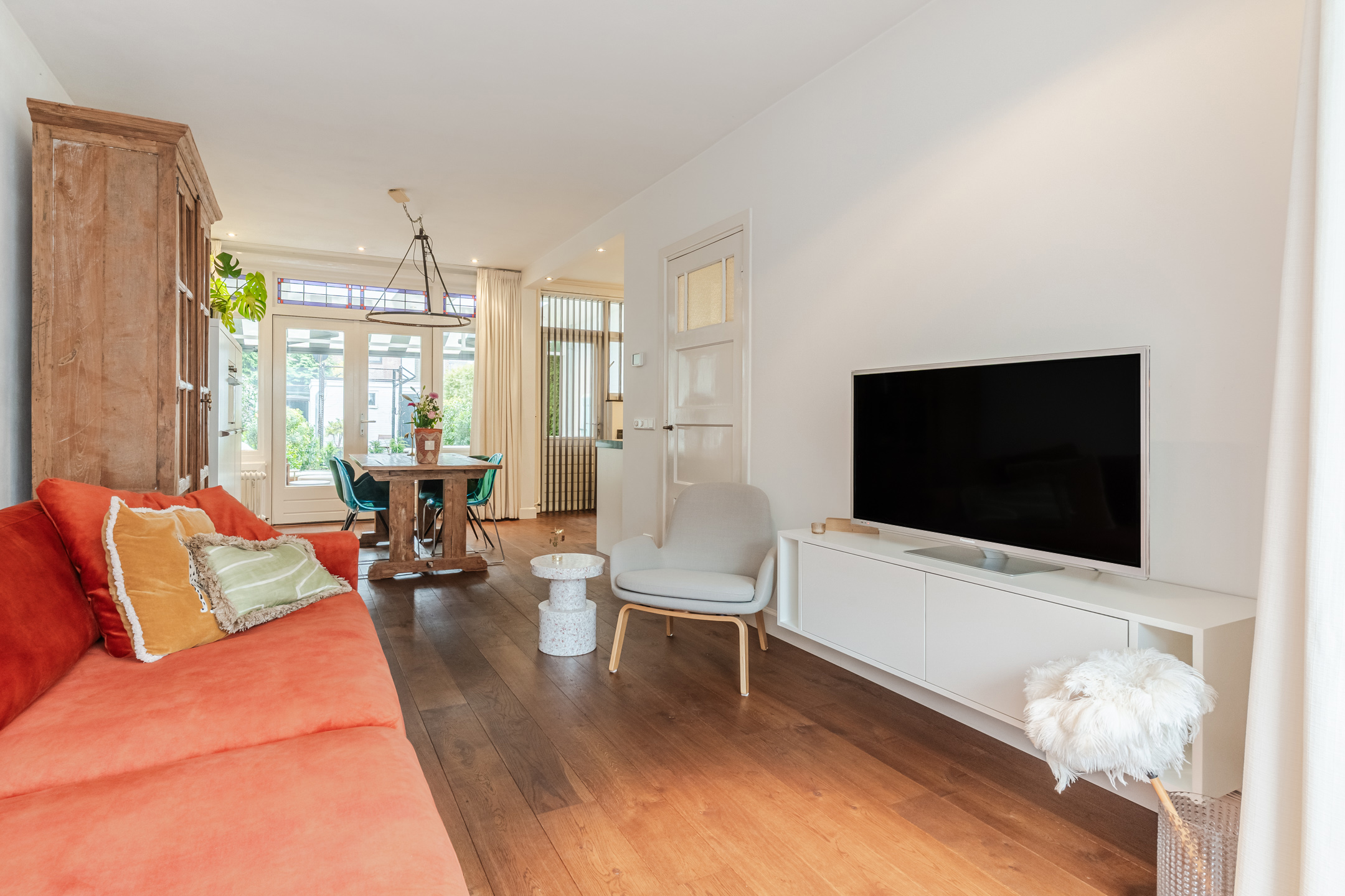De keurig aangelegde voortuin zorgt voor een fraai aanzicht. Entree van de woning door middel van een markante voordeur. In de hal is de authentieke travertinvloer bewaard gebleven. Onder de trapopgang is een praktische bergkast gerealiseerd voor extra opslag mogelijkheden. Naast deze ruimte is een verzorgde toiletruimte gelegen. De sfeervolle woonkamer met een erker en een warme houten vloer is aan de voorzijde van de woning gelegen. De woonkeuken is aan de achterzijde gelegen en is voorzien een keurig keukenmeubel in hoekopstelling met een extra wandopstelling. Het keukenmeubel bestaat uit diverse kasten, laden en apparatuur: een brede “Boretti” oven met daarboven een 6-pits gasfornuis met wokbrander, afzuigkap, vaatwasser, combi-oven/magnetron, vriezer en koelkast. Vanuit de keuken door middel van openslaande deuren de achtertuin te bereiken. De luxe overkapping (2024) is met hoogwaardige materialen afgewerkt en voorzien van lichtkoepels, spotjes en is er een zonneluifel voor de nodige schaduw in de achtertuin. Deze overkapping biedt de ideale plek om al vroeg in het jaar van de zon te kunnen genieten of de zomeravonden heerlijk te verlengen! De diepe en privacy biedende achtertuin van circa 18 meter is gelegen op het zonnige zuidwesten. De tuin is keurig aangelegd met verschillende plantenborders met veel groen een waterpartij. Achterin de tuin bevindt zich de fietsenberging en een poort voor de achterom.