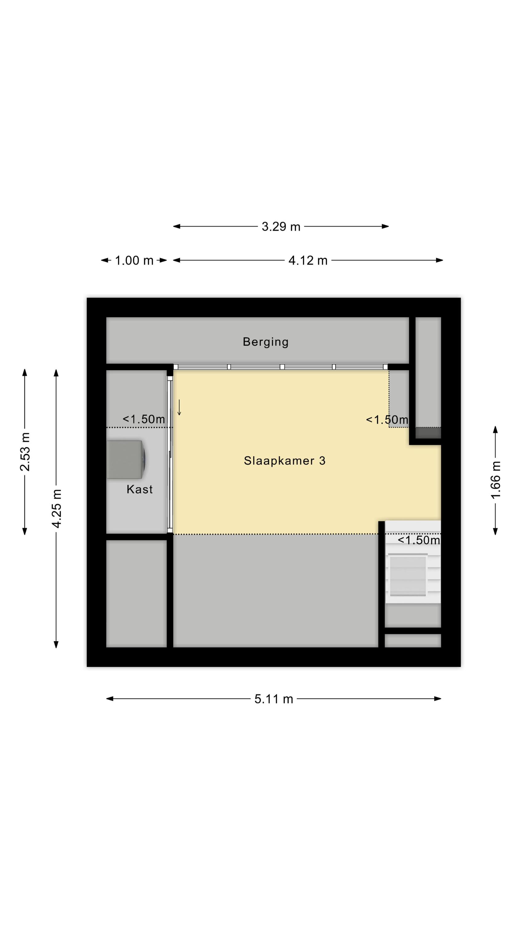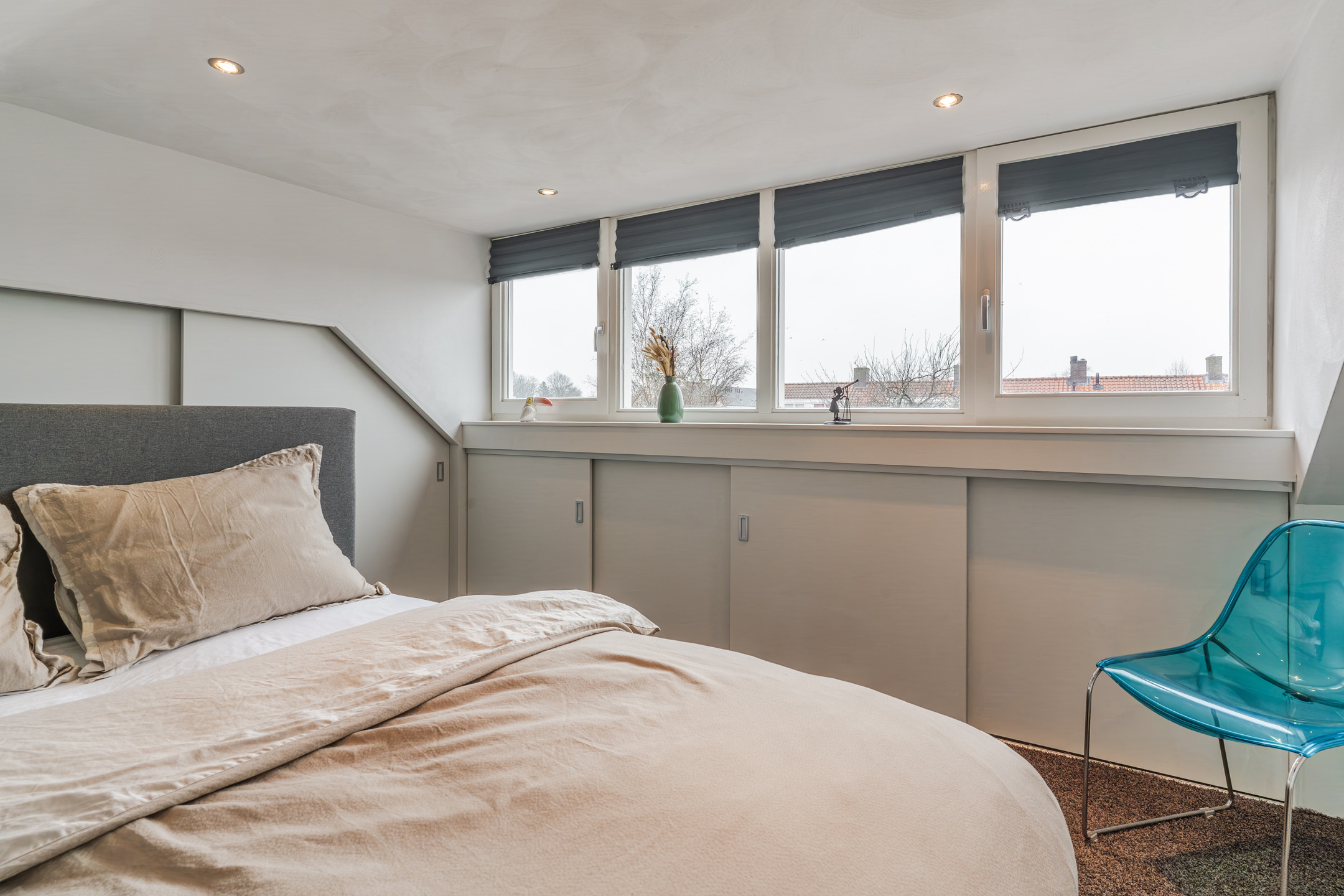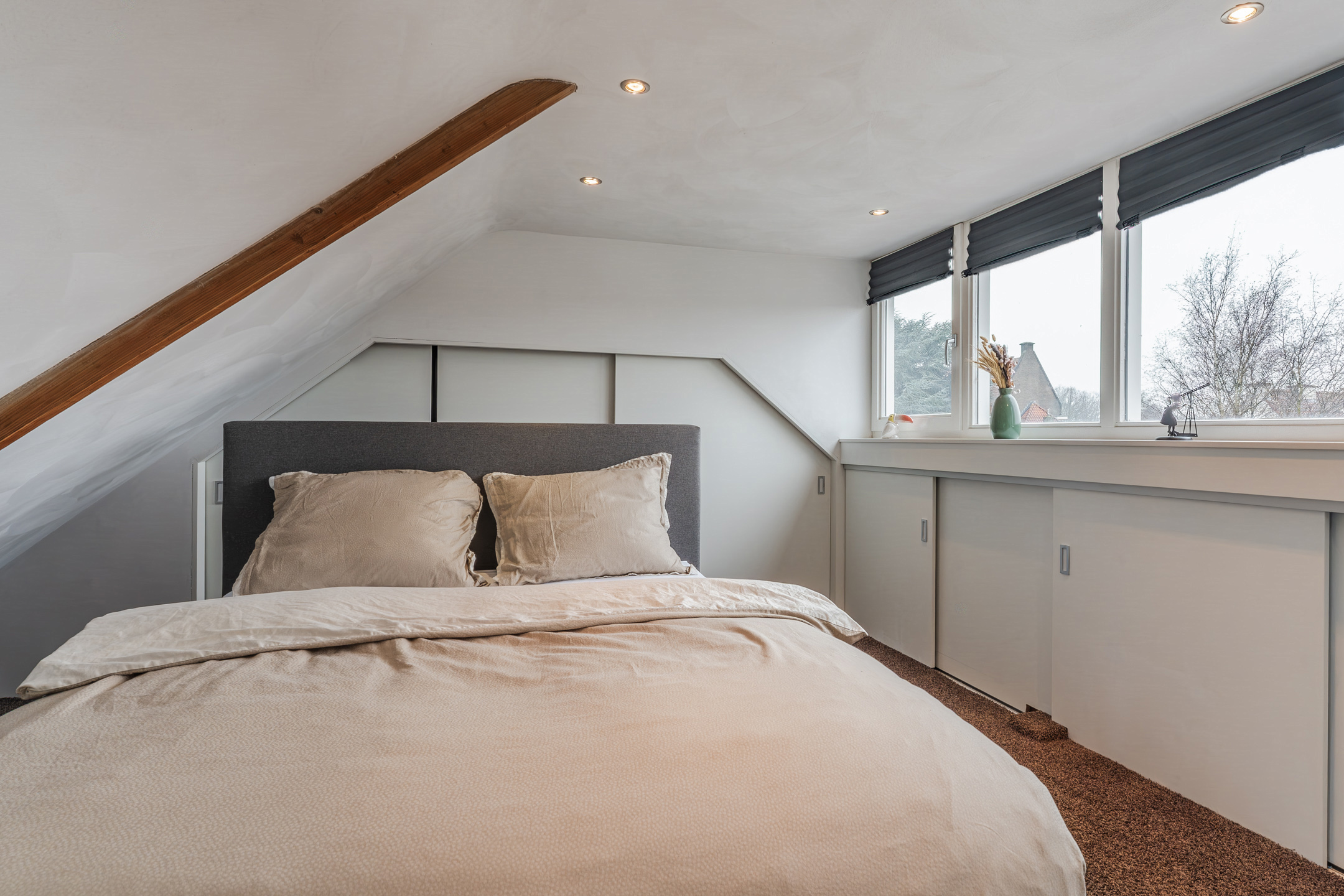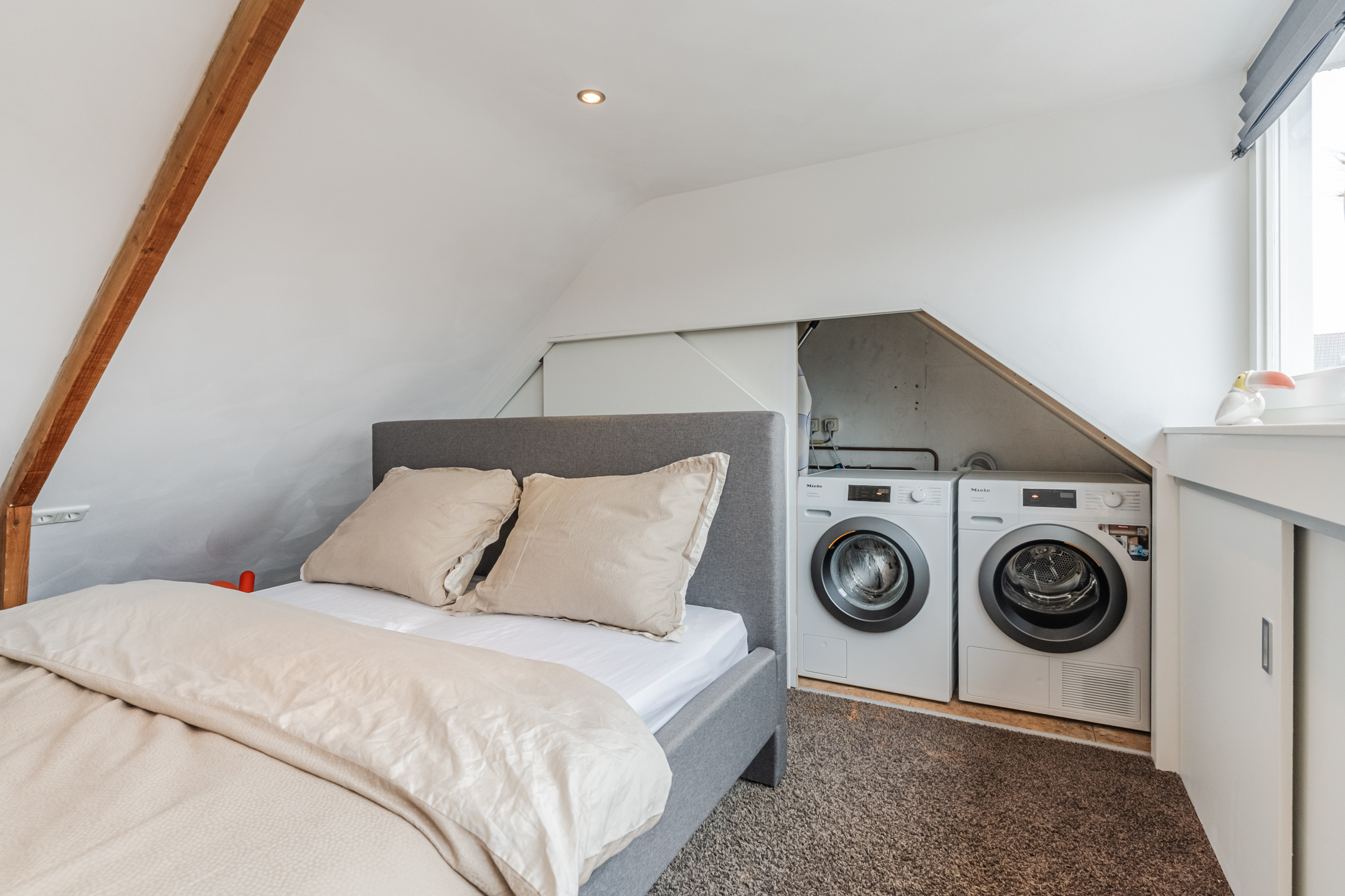 Middels een vaste trap is een volwaardige verdieping bereikbaar. Deze verdieping, in gebruik als 3e slaapkamer is voorzien van een royale dakkapel die de ruimte aanzienlijk vergroot. Onder de kapschuiten zijn diverse knieschotten gerealiseerd voor extra opslagruimte. De aansluitingen voor was- en droogapparatuur zijn keurig weggewerkt achter een ingebouwde kast.