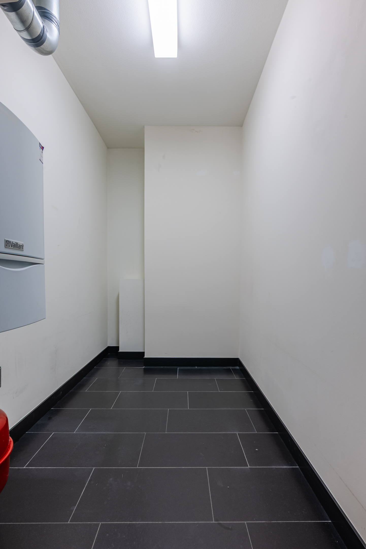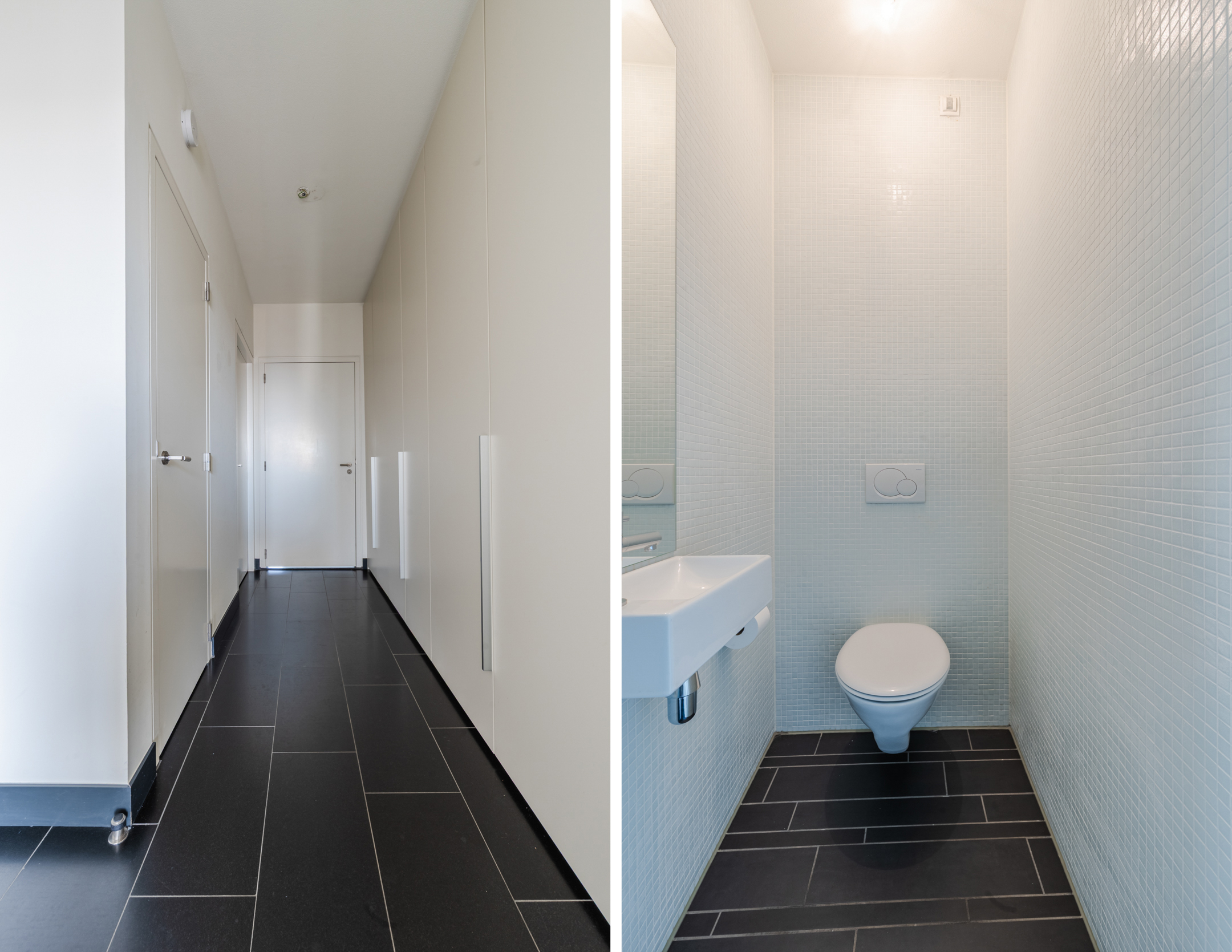 Vanuit zowel de badkamer als de ontvangsthal is er een ruime tussenhal te bereiken voorzien van een luxe, op maat vervaardigde vaste kastenwand van het Italiaanse merk “Poliform” waarin u veel spullen kunt opbergen. Deze hal geeft toegang tot een modern afgewerkt gastentoilet met hangend closet en een fonteintje. De praktische bijkeuken beschikt over veel bergruimte en bevat de opstelling van de CV-installatie en de aansluitingen voor was- en droogapparatuur.