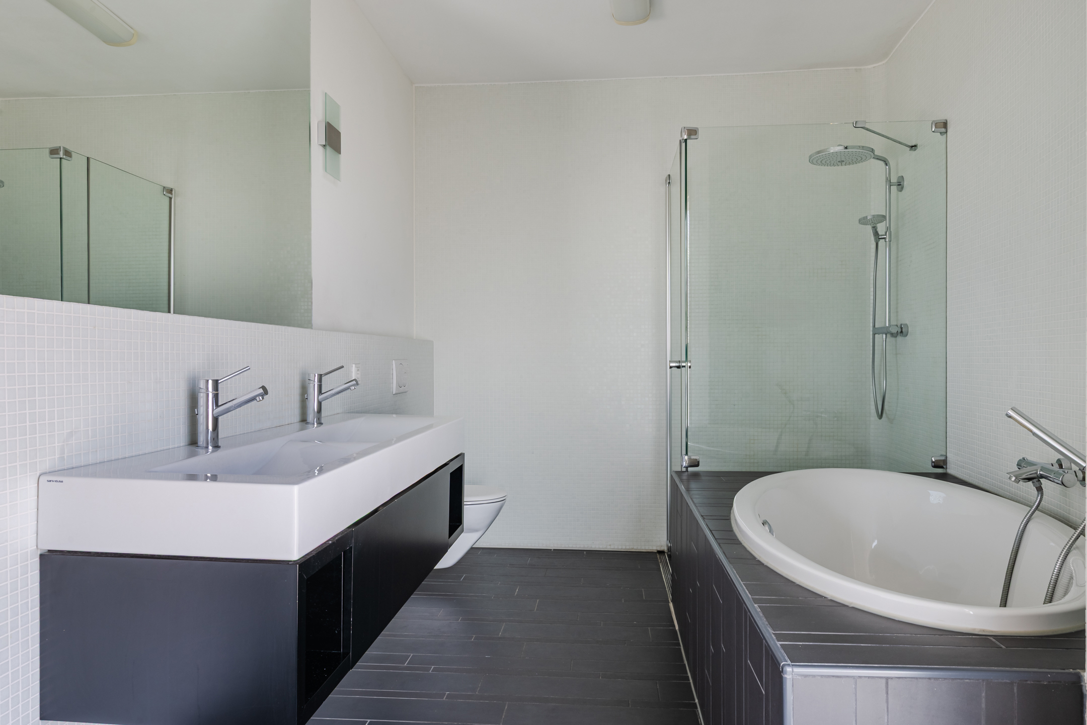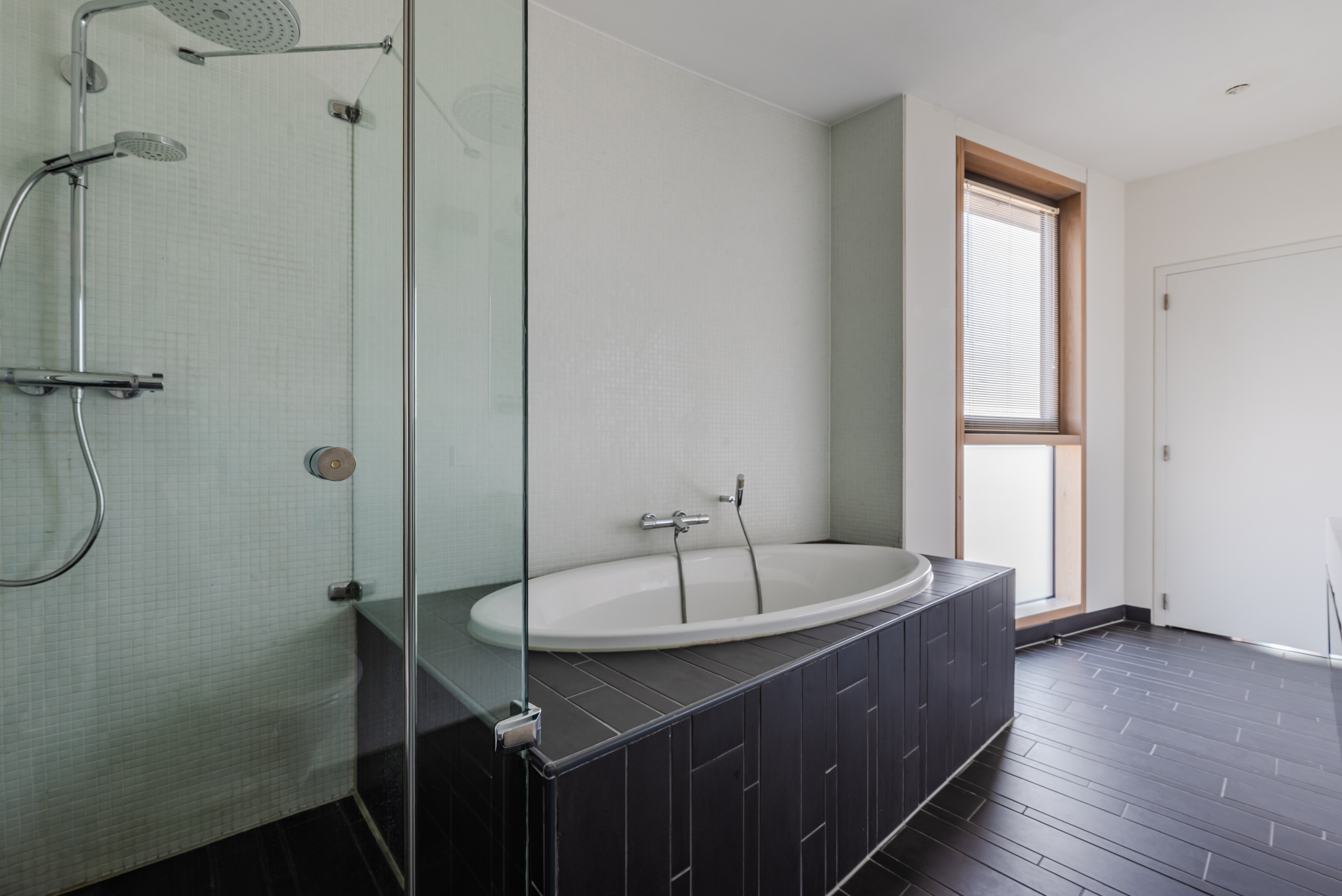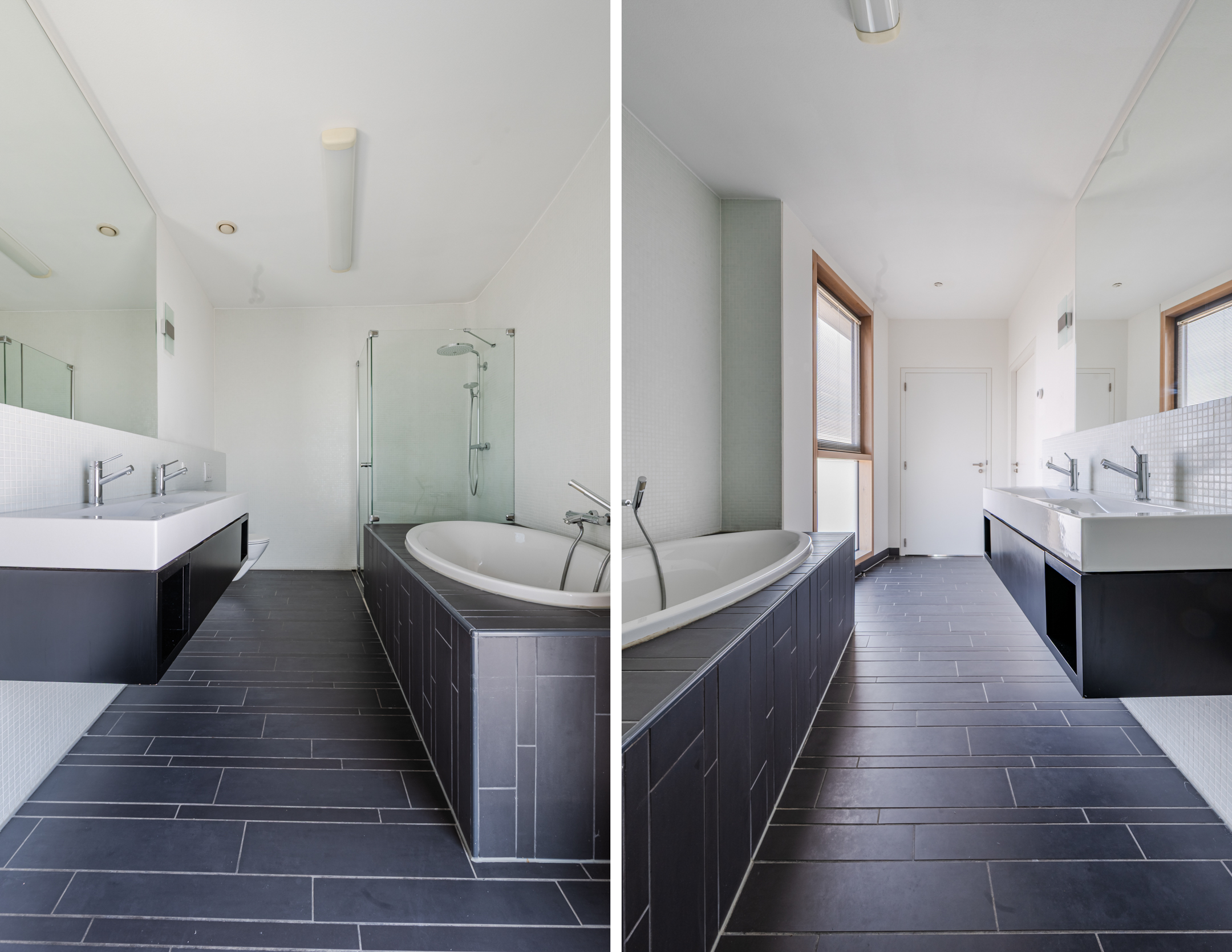 De hoofdslaapkamer is keurig afgewerkt en ook voorzien van grote raampartijen. De slaapkamer geeft toegang tot de badkamer. Deze geheel betegelde en moderne badkamer is voorzien van compleet sanitair; een groot ligbad, inloopdouche met thermostaatkraan, dubbele wastafel in een fraai badkamermeubel en een extra toilet.