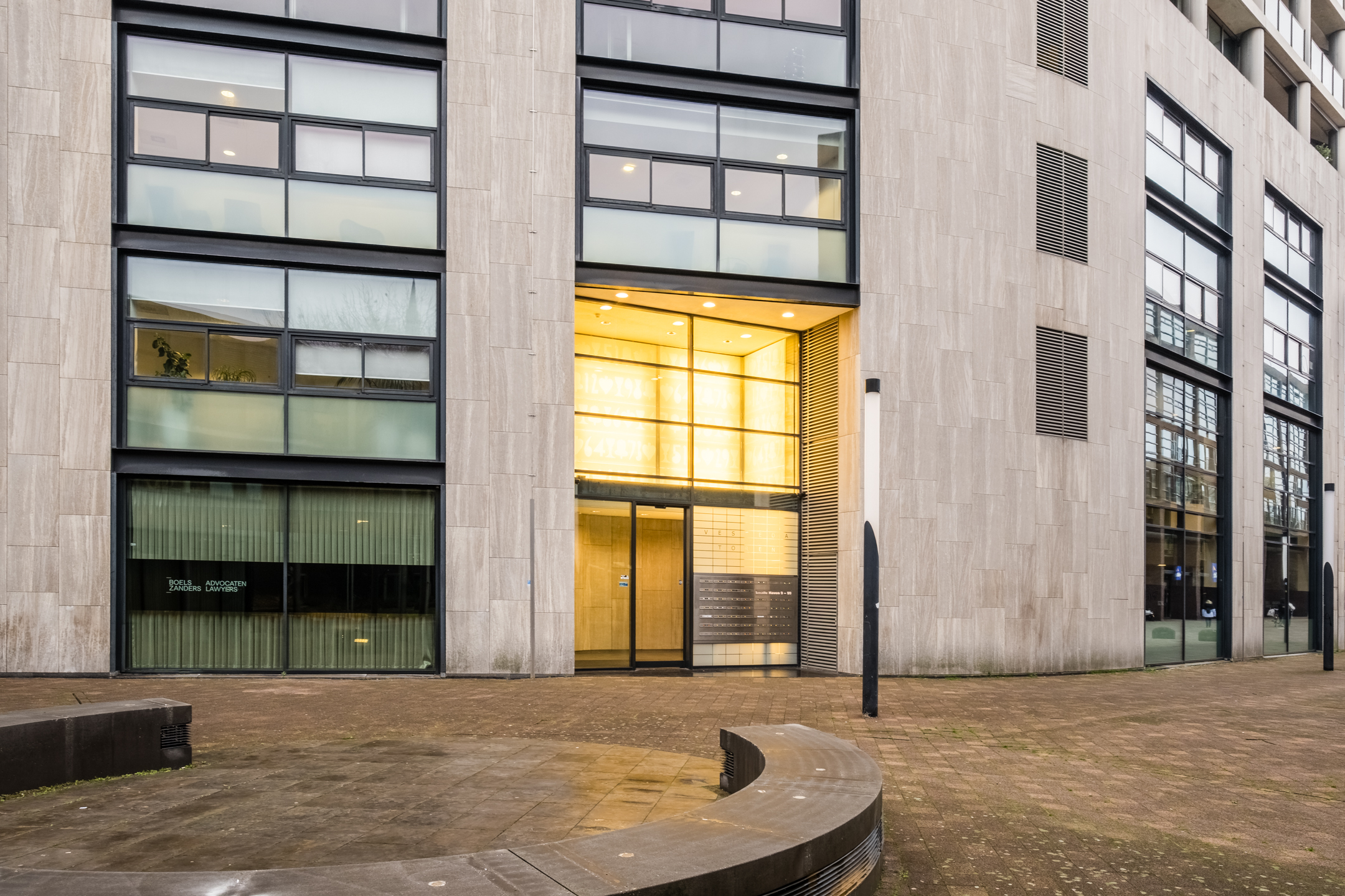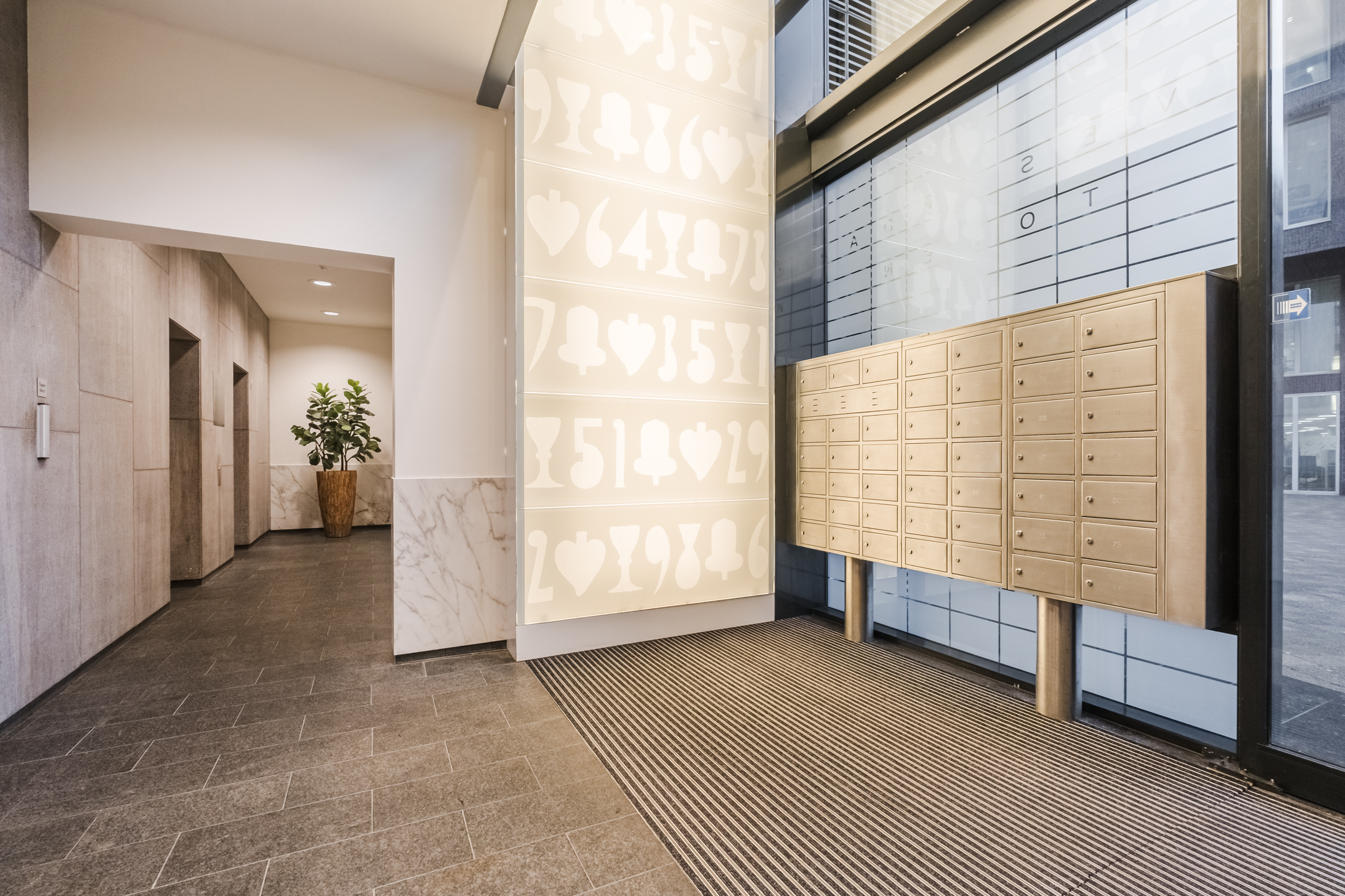 Centrale entree met bellentableau/videofoon-installatie en brievenbussen. Het trappenhuis en meerdere liftinstallaties geven toegang tot de woonetages.