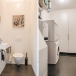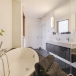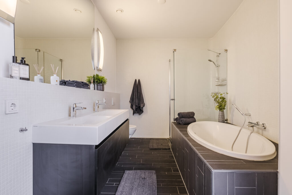 The serene bedroom includes custom-made wardrobes and direct access to the modern bathroom with bathtub, walk-in shower, double washbasin and second toilet. Two cleverly integrated home office spaces—one in the living room and one in the bedroom—ensure effortless remote working for two people.