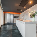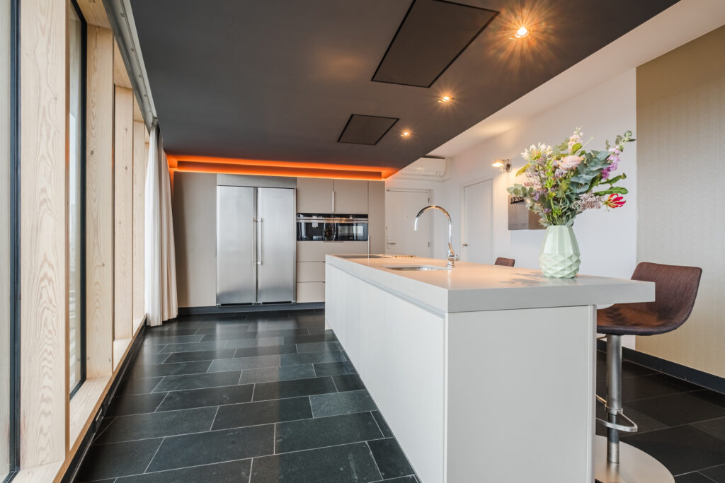 De open keuken is een elegante combinatie van stijl en functionaliteit. Voorzien van hoogwaardige apparatuur, een composieten werkblad, een chique wandopstelling met Amerikaanse koelkast- en vriezer, ingebouwde koffiecorner en combi-oven. Hier kookt u niet alleen: u beleeft.