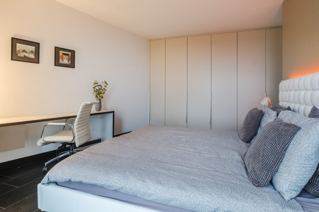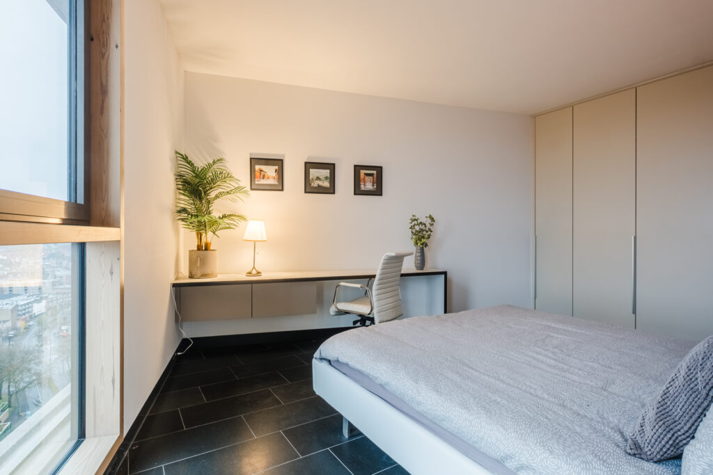 In zowel de woon- als slaapkamer zijn twee elegante en geïntegreerde werkplekken gecreëerd. Ideaal voor wie flexibel werkt of simpelweg graag in alle rust geconcentreerd blijft.