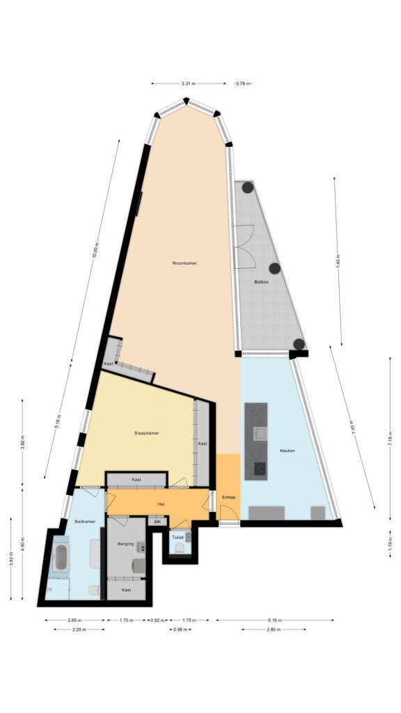 Zodra u binnenstapt, bent u omringd door de royale gebogen raampartijen die het bruisende stadsbeeld als levende kunst naar binnen halen. De hoge plafonds versterken het gevoel van vrijheid, terwijl de speelse indeling uitnodigt om uw leven precies zo in te delen als u wilt.