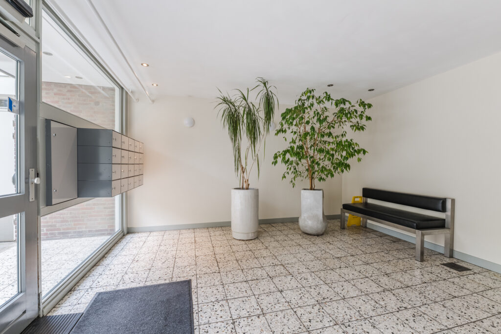 De verzorgde centrale entree is voorzien van een bellentableau, intercominstallatie en brievenbussen. Vanuit de centrale entree heeft u toegang tot het trappenhuis, de liftinstallatie en de individuele bergingen.