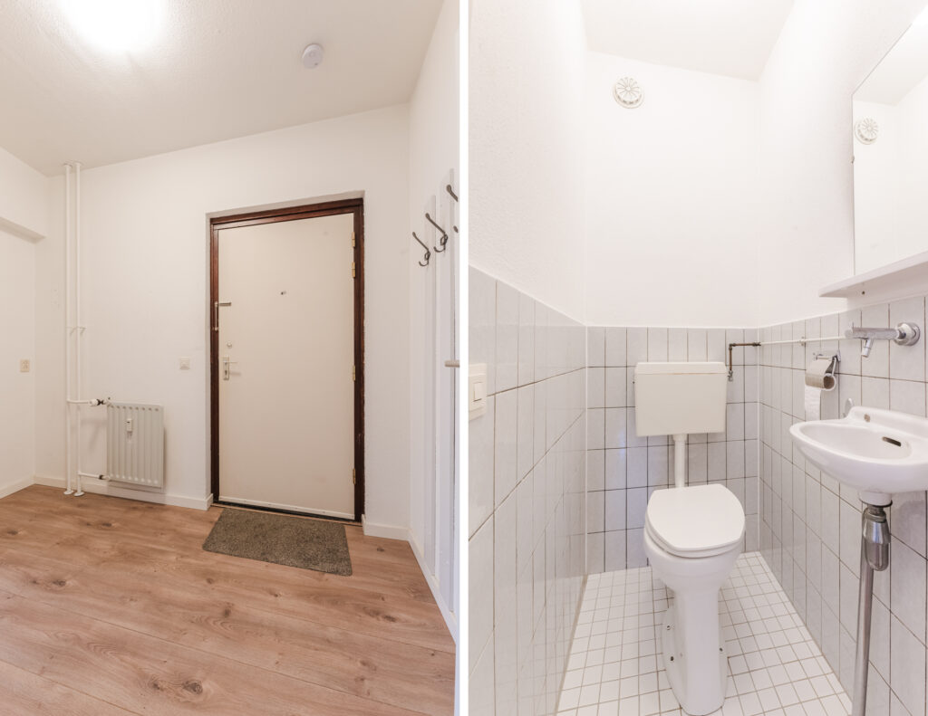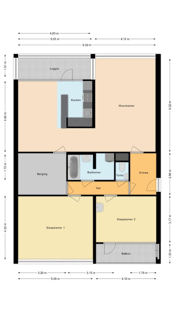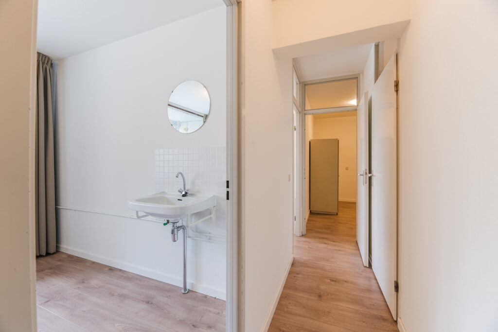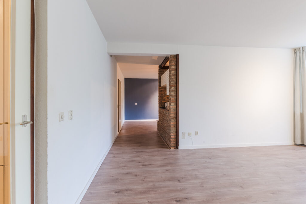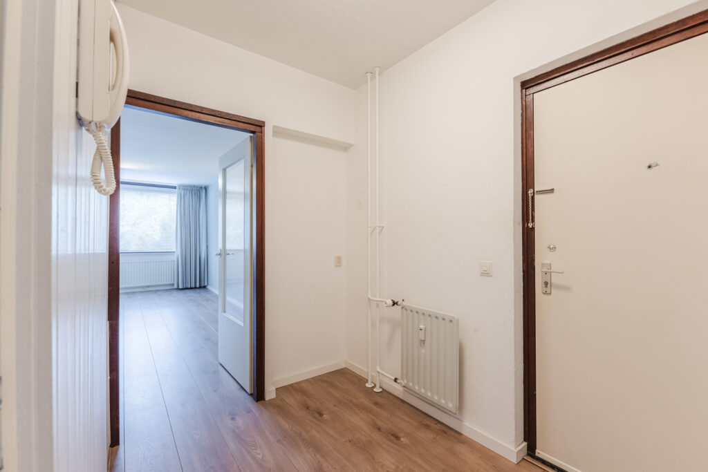 De voordeur geeft toegang tot de hal van het appartement. De hal is voorzien van een laminaatvloer welke doorloopt tot in de gehele woonkamer, keuken en slaapkamers. Vanuit de hal toegang tot alle vertrekken in het appartement.