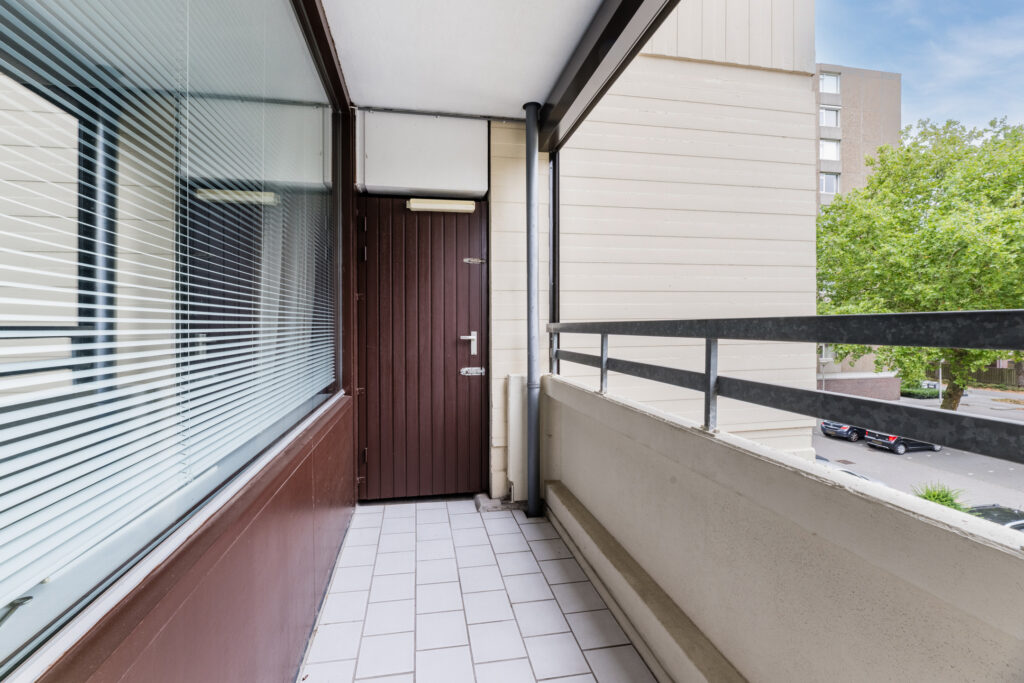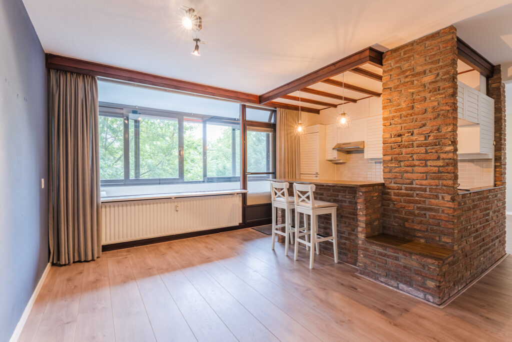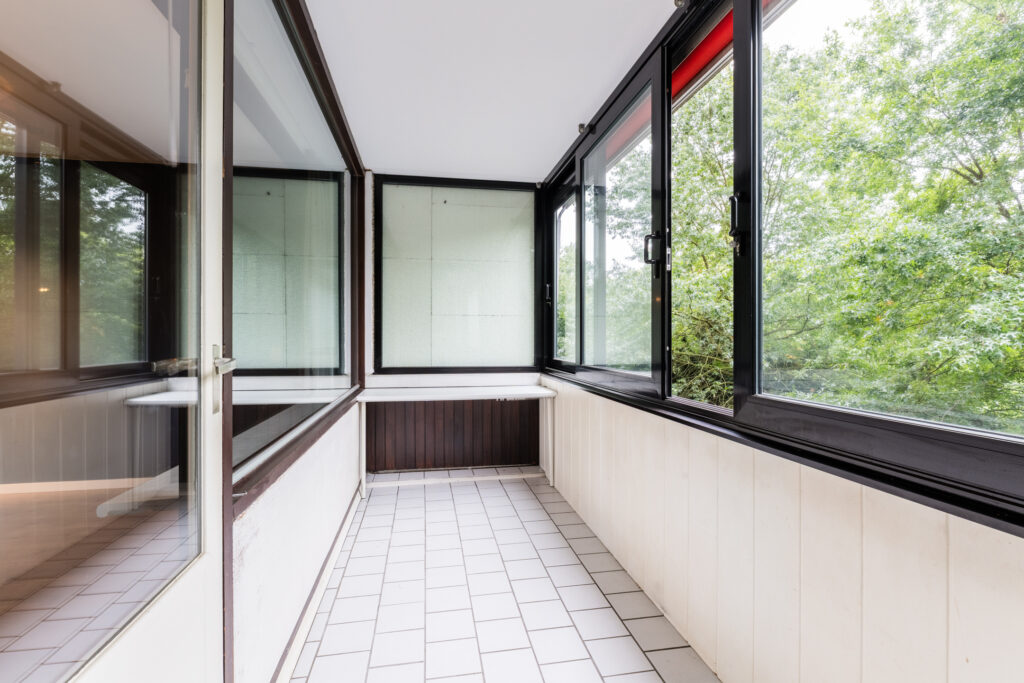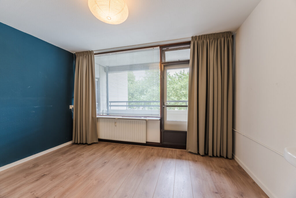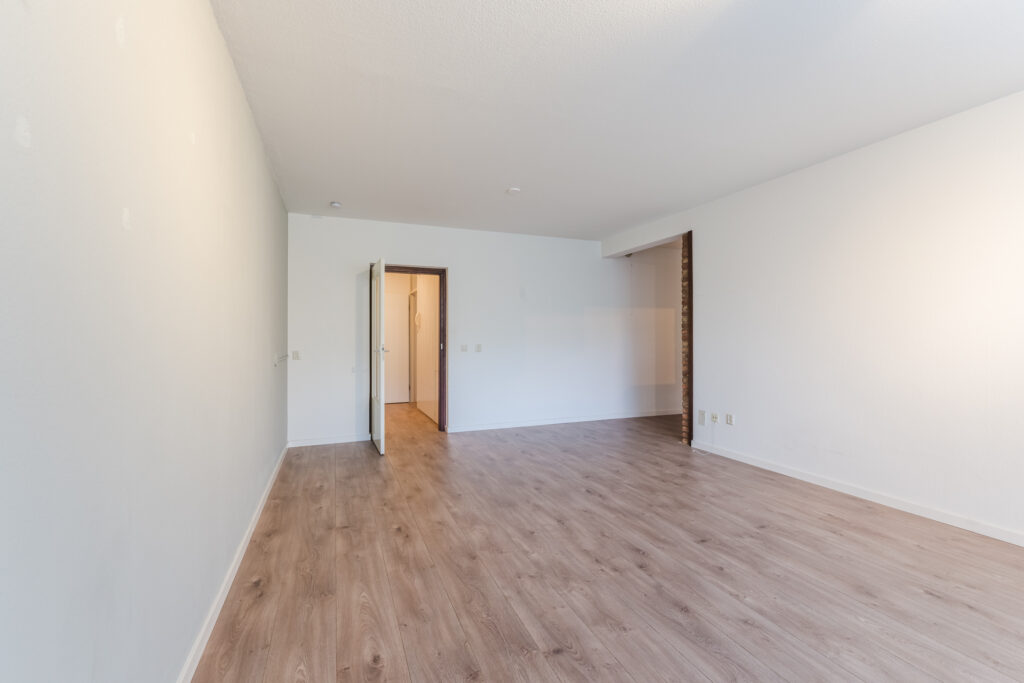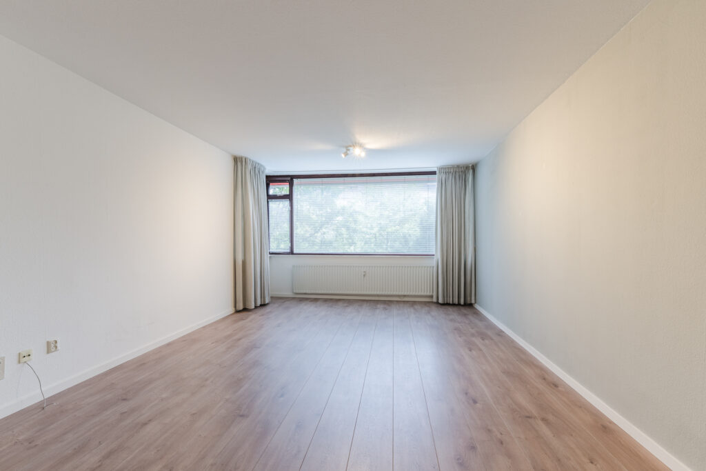 De royale woonkamer is speels ingedeeld wat een leuk effect geeft aan de ruimte. Het eetgedeelte is gescheiden van het woongedeelte. Vanwege de grootte zijn hier diverse indelingsmogelijkheden. De gehele ruimte is voorzien van grote raampartijen die zorgen voor veel lichtinval. Middels een deur vanuit de keuken heeft u toegang tot het balkon. Het balkon is gelegen op het westen met afsluitbare schuiframen, een fijne plek om ontspannen en te genieten. Aan de gevel is een zonneluifel gerealiseerd welke zorgt voor de nodige schaduw.