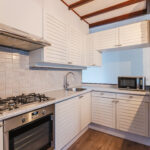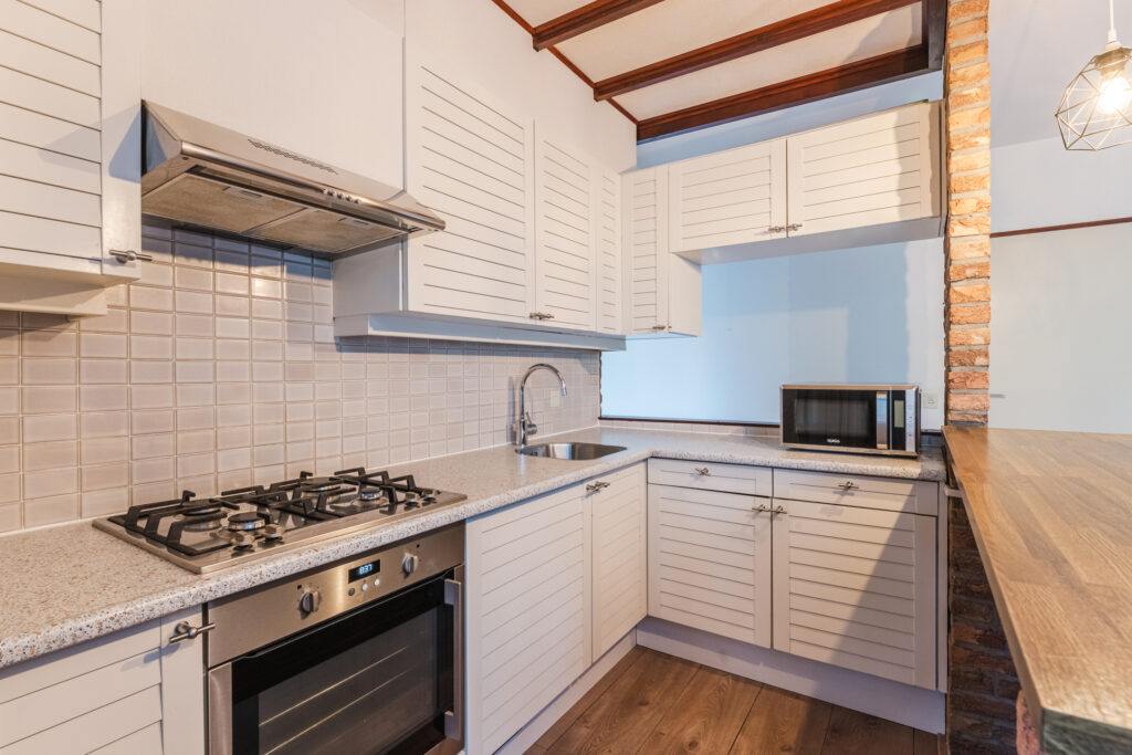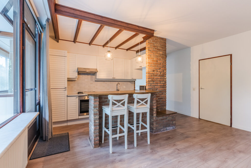 Tussen het eet- en het woongedeelte treft u een nette keuken in U-opstelling voorzien van eetbar, diverse onder- en bovenkasten, laden en inbouwapparatuur, waaronder een gaskookplaat, RVS-afzuigschouw, koelkast-vriescombinatie, oven en vaatwasser.