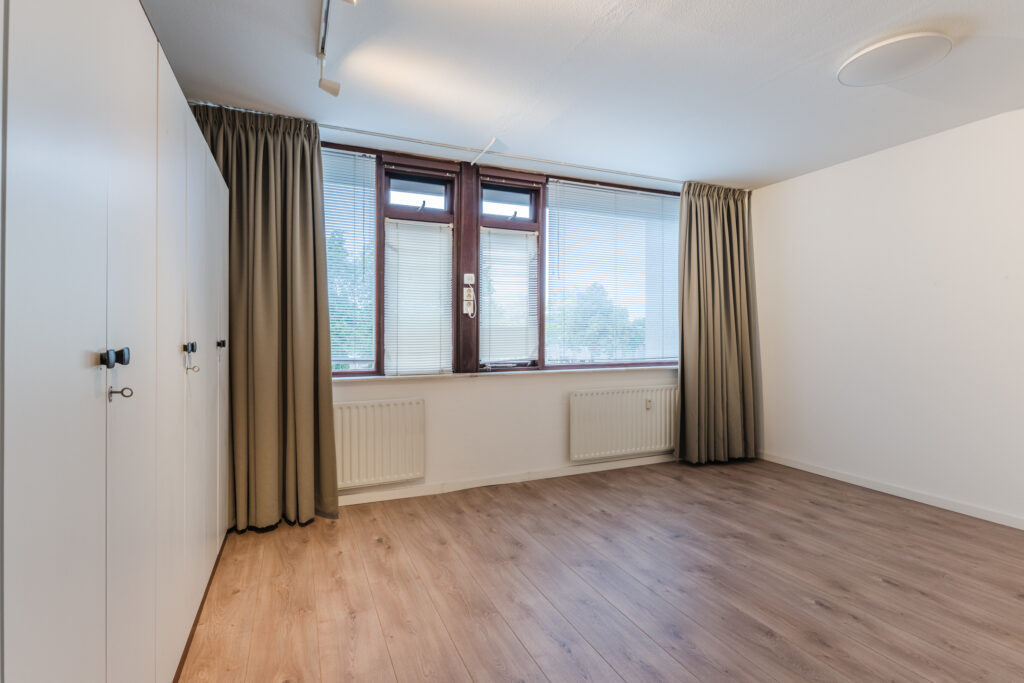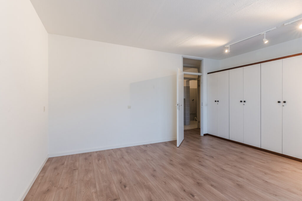De slaapkamer is voorzien van royale kastenwand en elektrisch rolluik. Deze beschikt ook hier over grote raampartijen die zorgen voor veel lichtinval. Voorheen was deze hoofdslaapkamer gesplitst in twee slaapkamers.