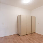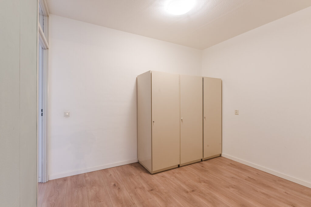 De tweede slaapkamer is eveneens keurig afgewerkt en is voorzien van een vaste wastafel. Een deur biedt toegang tot een kleiner balkon met bergkast en elektrisch rolluik.