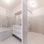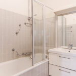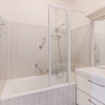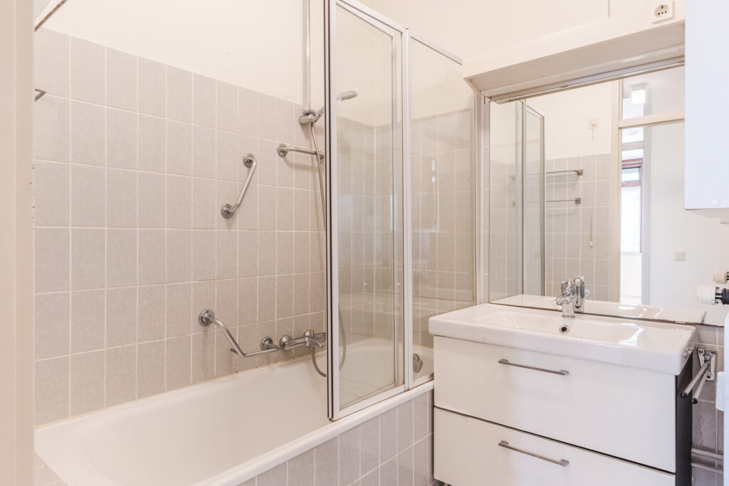 De geheel betegelde badkamer is voorzien van een badkamermeubel met vaste wastafel. Een aparte hoek van de badkamer is voorzien van aansluitingen voor was- en droogapparatuur.