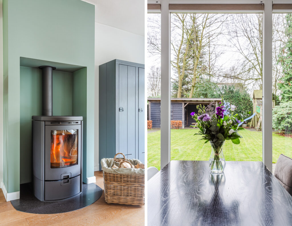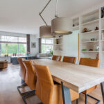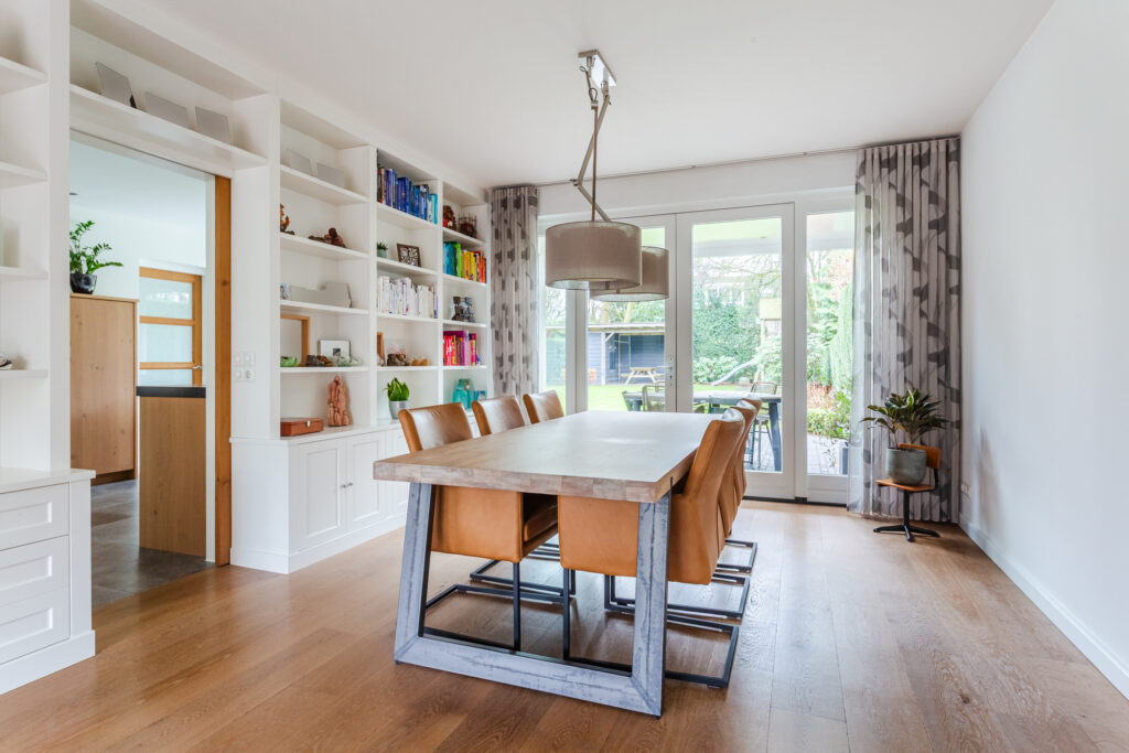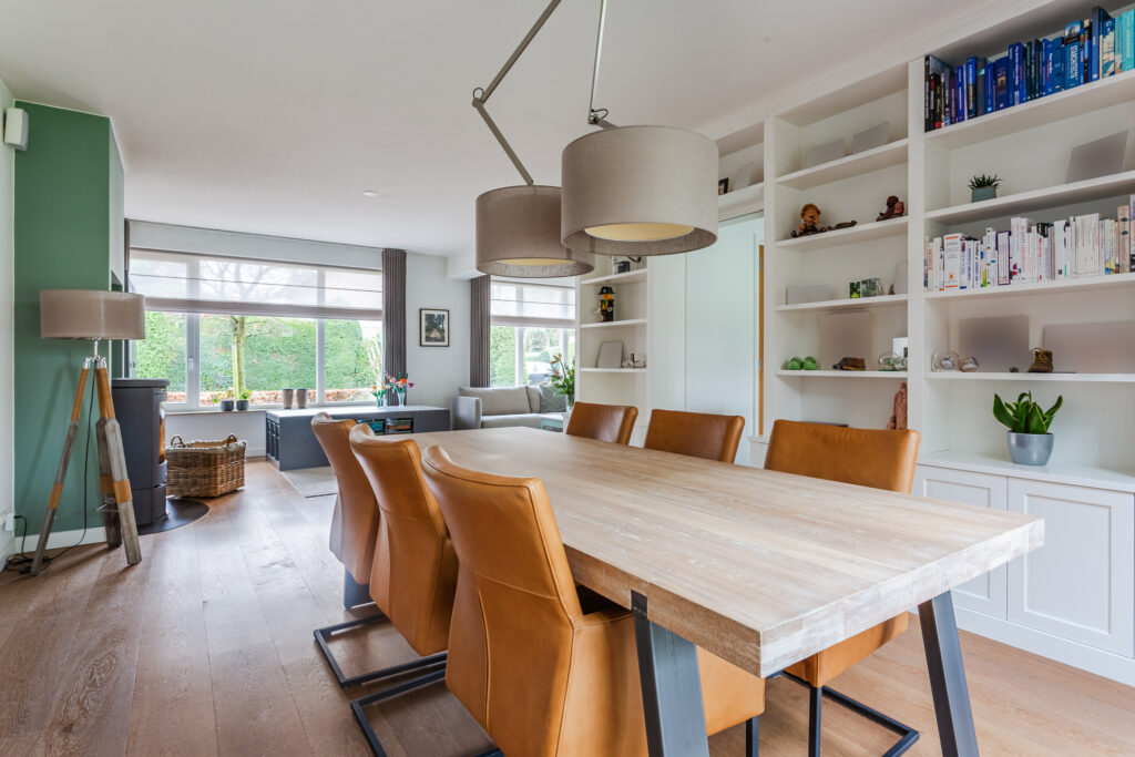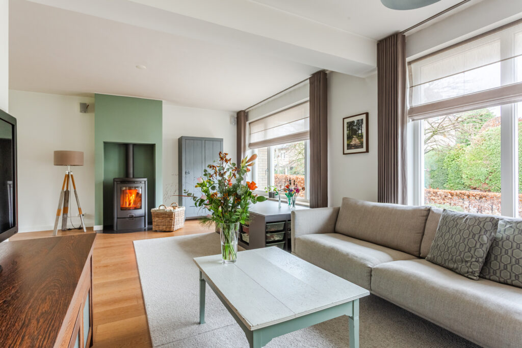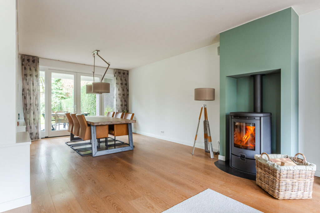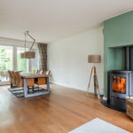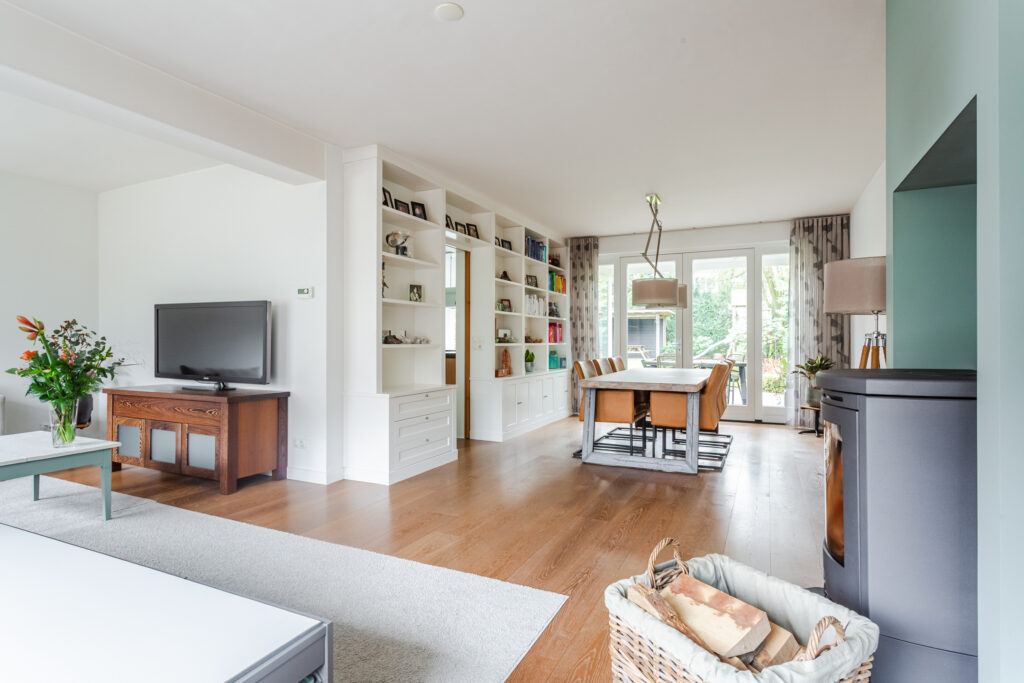 Aansluitend bevindt zich de royale en sfeervolle woonkamer van circa 43 m². De L-vormige indeling, openslaande tuindeuren en de houtkachel zorgen voor een warme, uitnodigende sfeer. De ruimte is afgewerkt met hoogwaardig (originele Di Legno houten vloer) parket (met daaronder vloerverwarming) en biedt dankzij de grootte diverse indelingsmogelijkheden. Grote raampartijen aan zowel de voor- als achterzijde zorgen ook hier voor een aangename lichtinval.