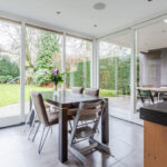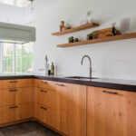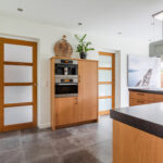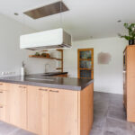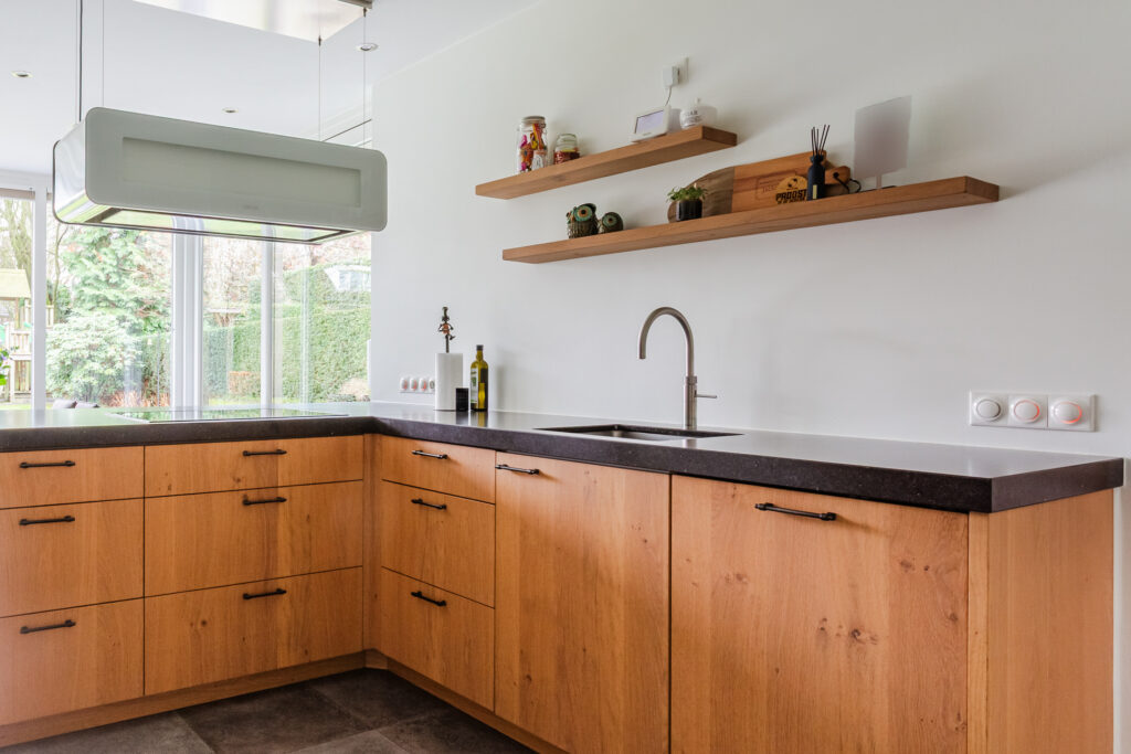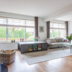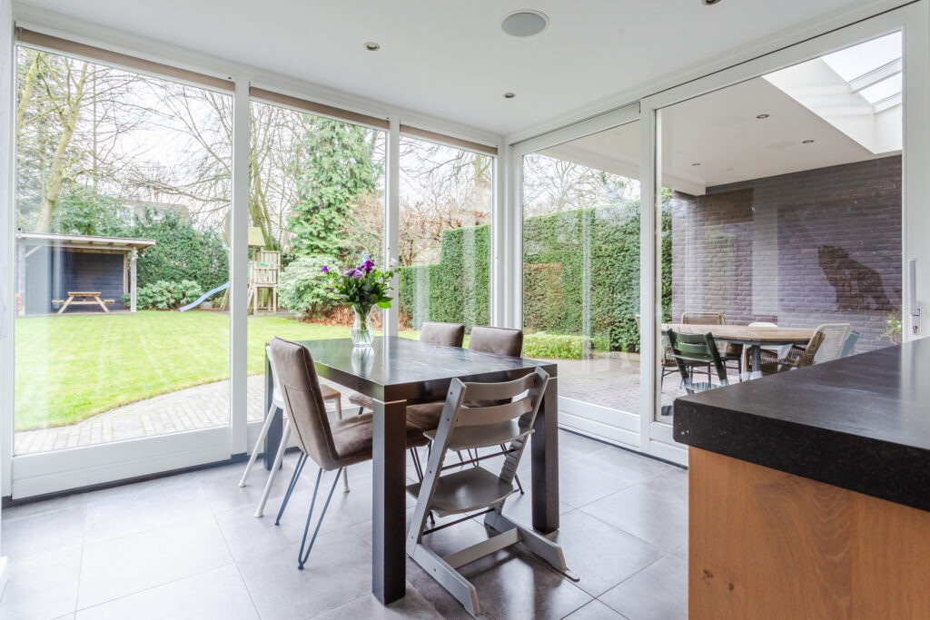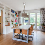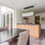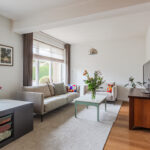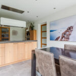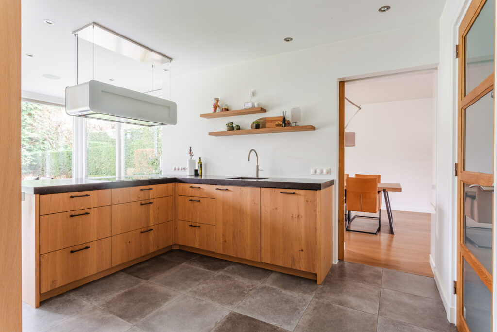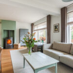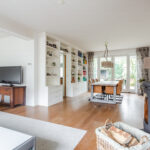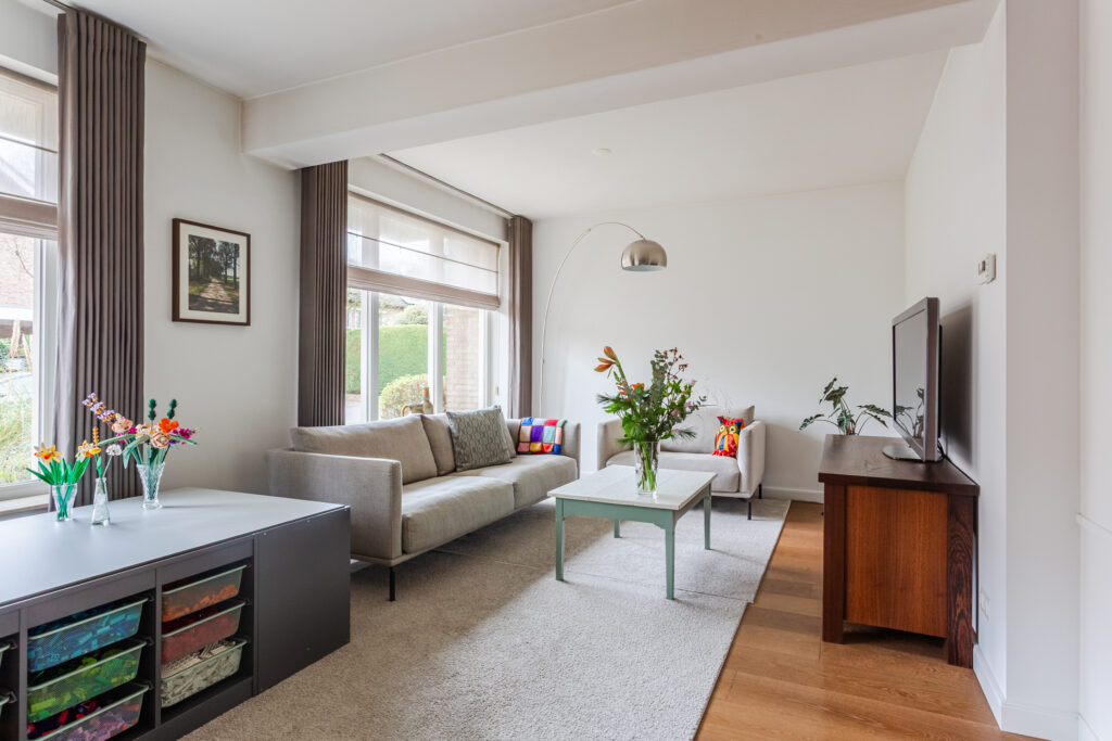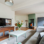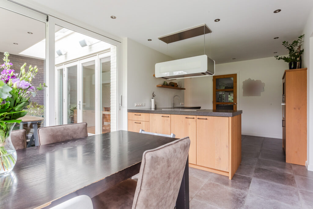 Aansluitend bevindt zich de royale en sfeervolle woonkamer van circa 43 m². De L-vormige indeling, openslaande tuindeuren en de houtkachel zorgen voor een warme, uitnodigende sfeer. De ruimte is afgewerkt met hoogwaardig (originele Di Legno houten vloer) parket (met daaronder vloerverwarming) en biedt dankzij de grootte diverse indelingsmogelijkheden. Grote raampartijen aan zowel de voor- als achterzijde zorgen ook hier voor een aangename lichtinval.
