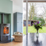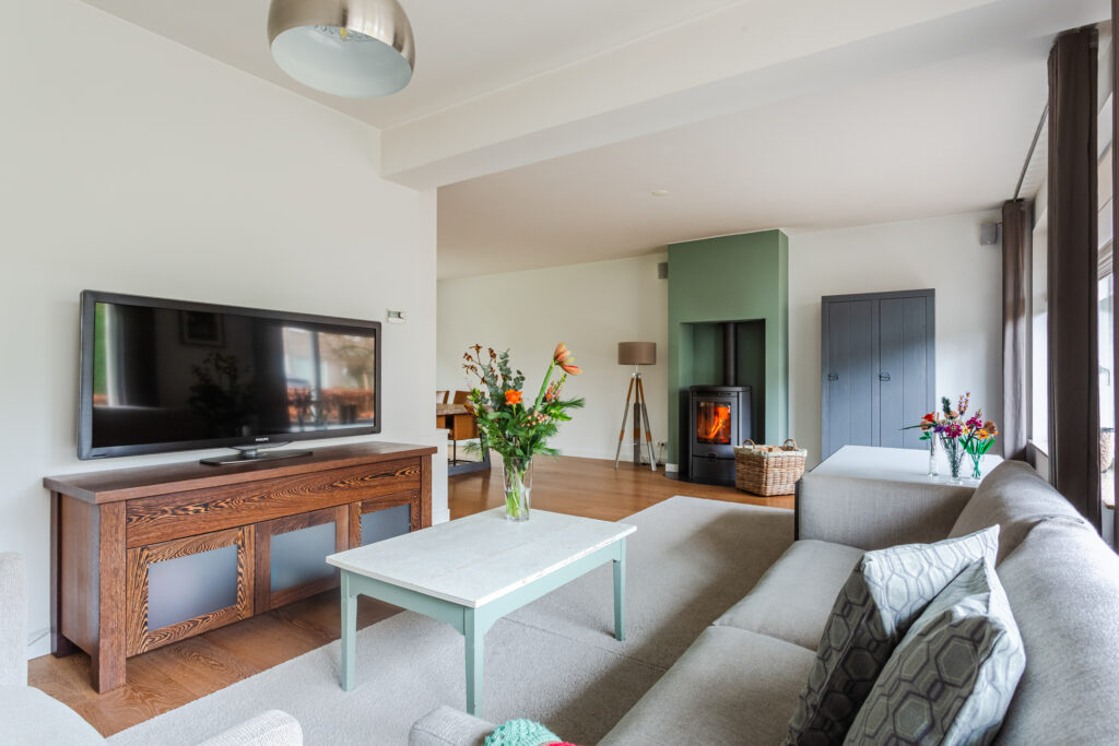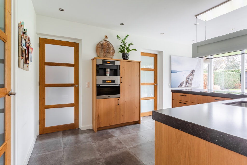 The ground floor features a bright living area with a cozy wood-burning stove, a luxury open kitchen with built-in appliances and direct access to the garden and covered terrace. Underfloor heating is installed in the kitchen, hallway, livingroom and utility room.