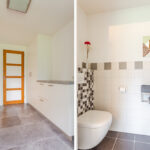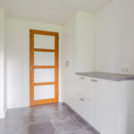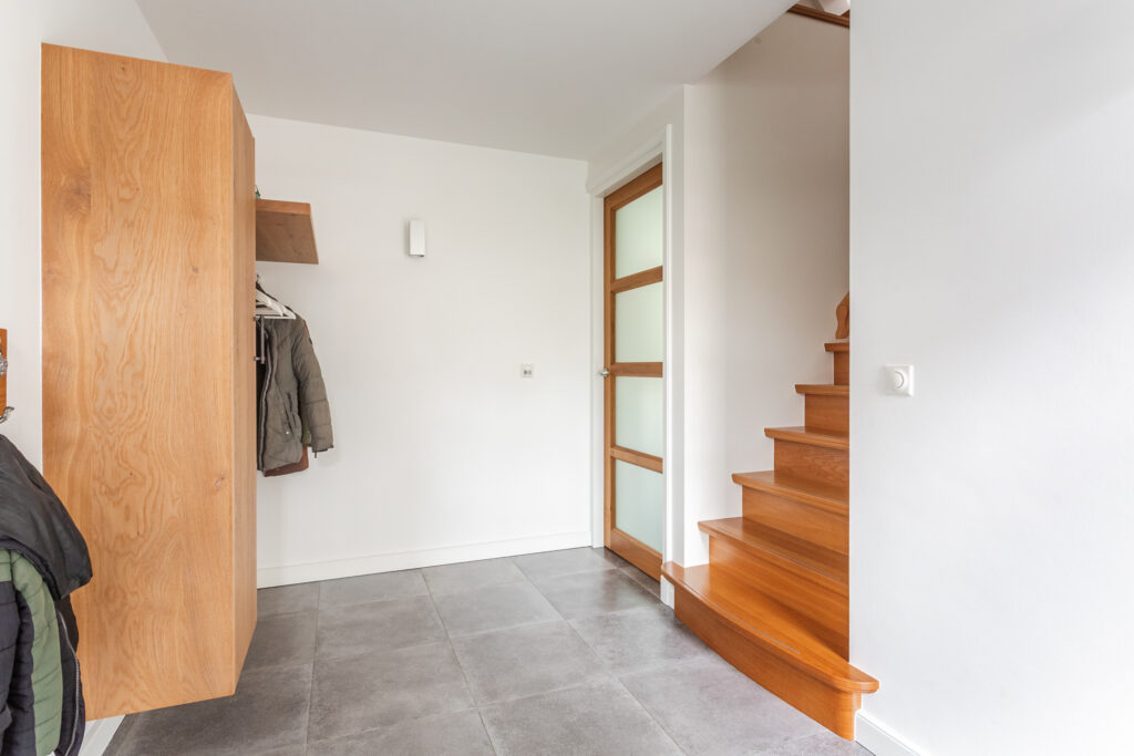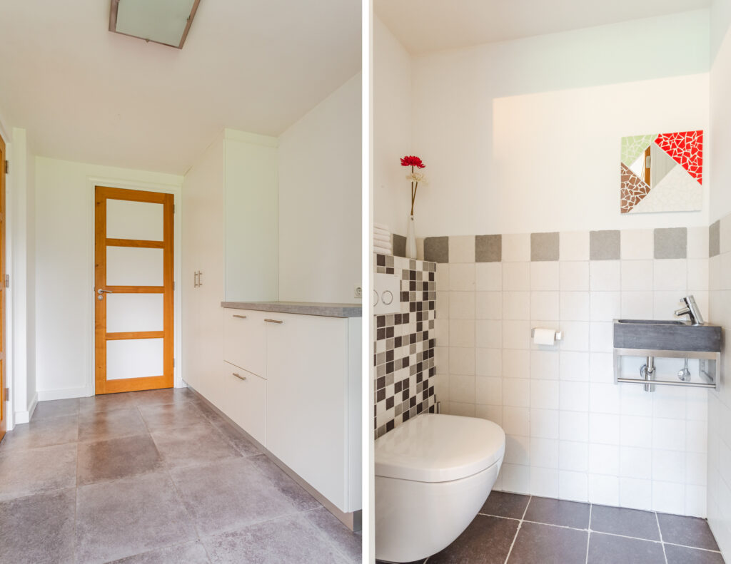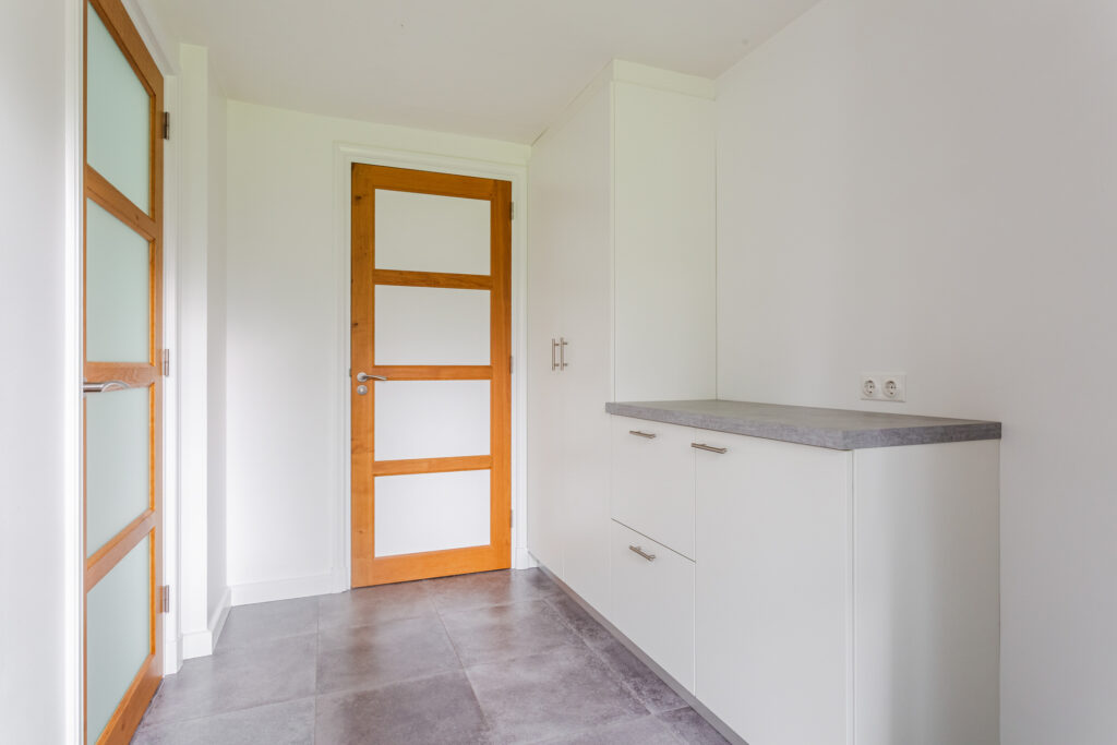 Verder beschikt de begane grond over een praktische bijkeuken met pantry en extra bergruimte, evenals een moderne toiletruimte met hangcloset en fonteintje. De keuken, hal en bijkeuken zijn voorzien van een moderne tegelvloer met vloerverwarming, wat bijdraagt aan het hoge wooncomfort.