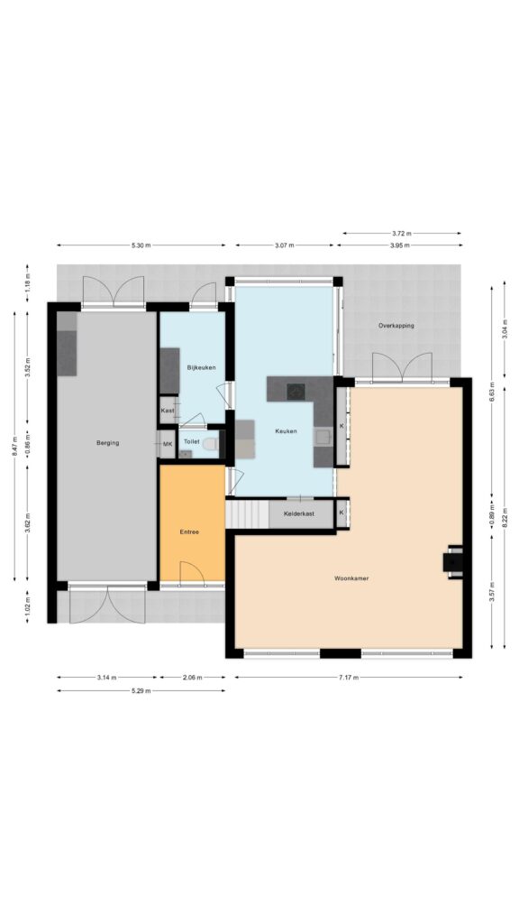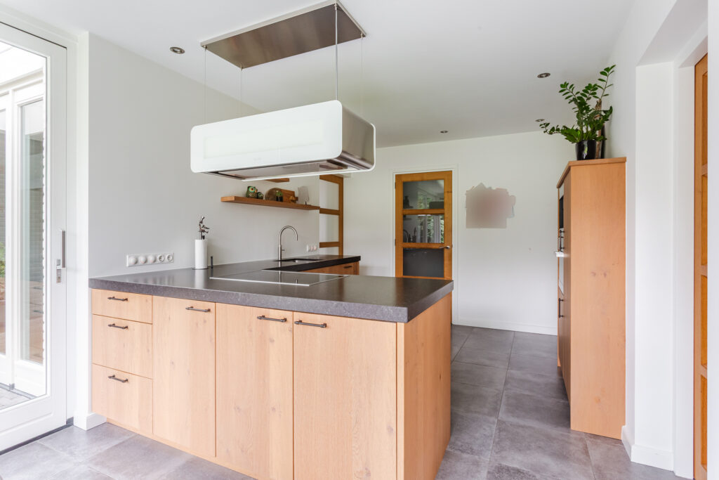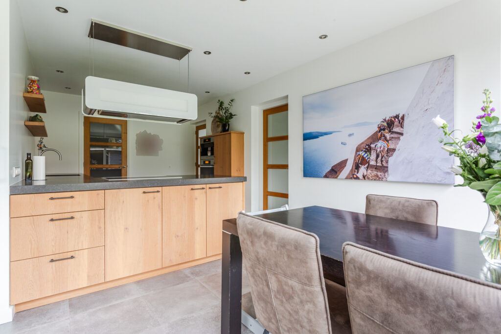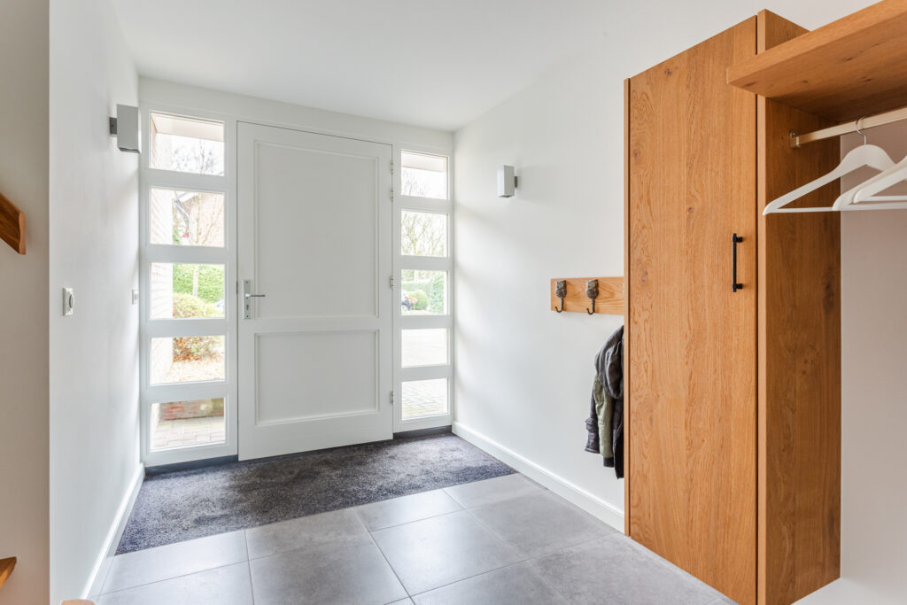 Via de overdekte entree komt u in een ruime ontvangsthal met garderobehoek. Aan de achterzijde van de woning bevindt zich de prachtige, uitgebouwde woonkeuken, waar met gemak een grote eettafel kan worden geplaatst. De keuken is uitgevoerd in een luxe L-opstelling met extra kastenwand en voorzien van alle denkbare inbouwapparatuur, waaronder een inductiekookplaat, moderne afzuigkap, vaatwasser, koelkast, combi-stoomoven, Quooker kraan én koffiemachine. Grote raampartijen zorgen hier voor een prachtige lichtinval en een fraai uitzicht op de tuin. Via de schuifpui bereikt u direct het overdekte terras. Tevens vanuit de keuken is een praktische kelderkast bereikbaar.