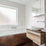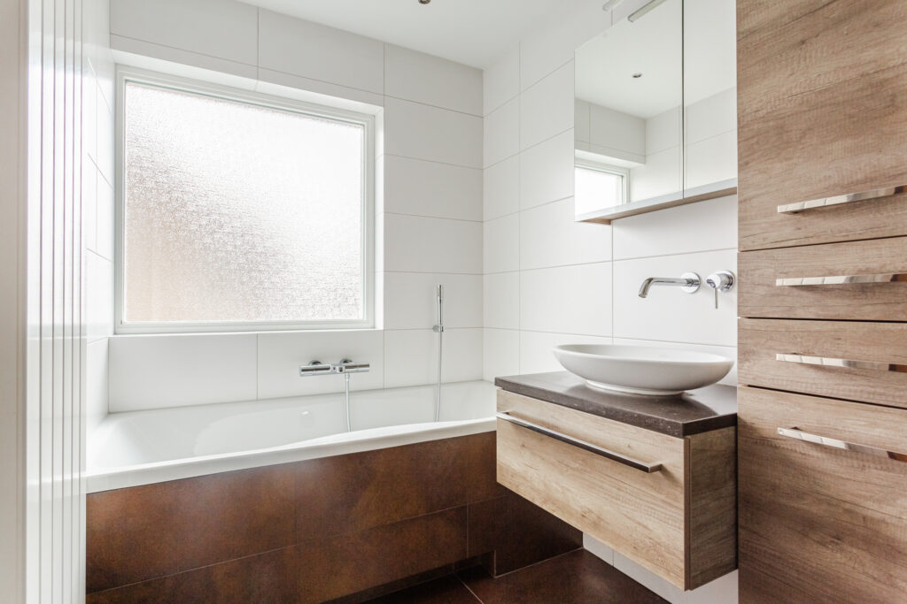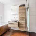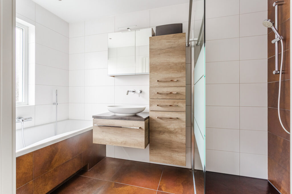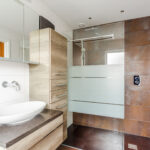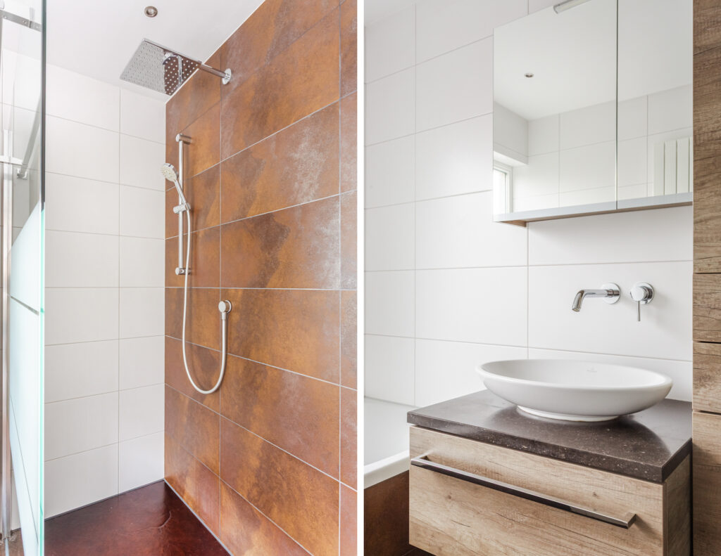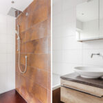 De moderne badkamer is slim ingedeeld en voorzien van een ligbad, ruime inloopdouche en een wastafelmeubel. Het toilet is separaat en eveneens modern uitgevoerd.