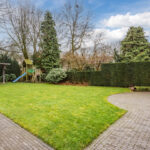 De keurig aangelegde voortuin beschikt over een dubbele oprit. De opvallend diepe garage is via openslaande deuren zowel aan de voor- als achterzijde toegankelijk, waardoor zelfs de achtertuin met een aanhanger bereikbaar is.