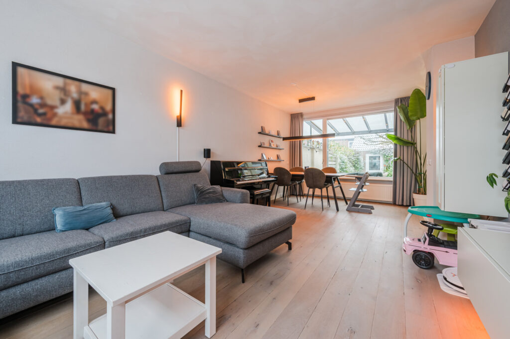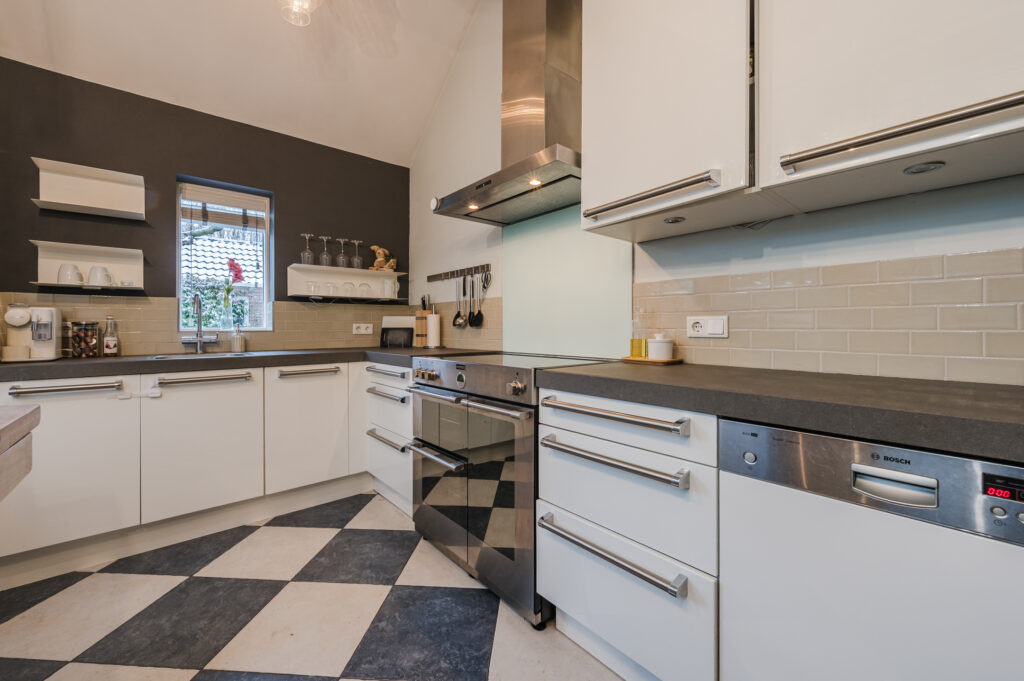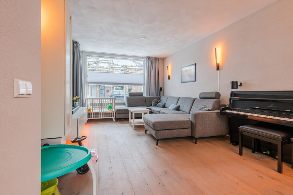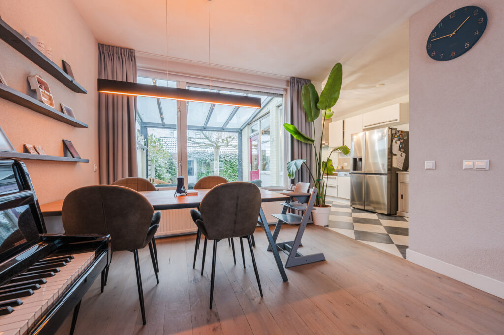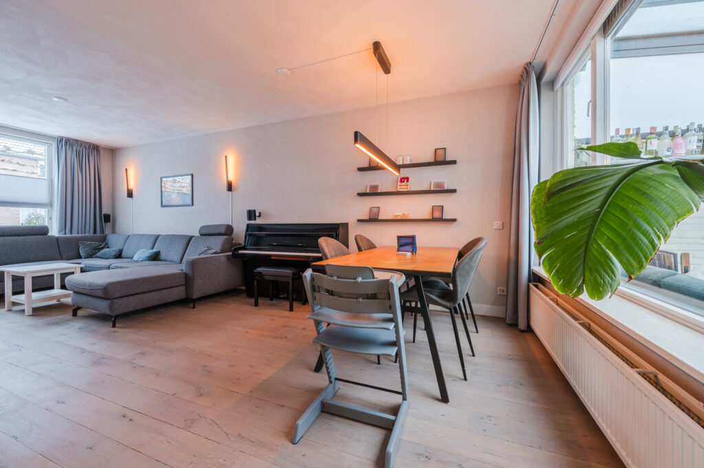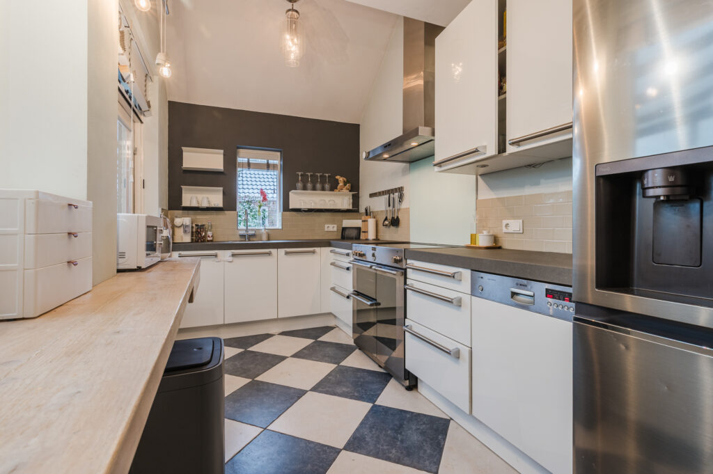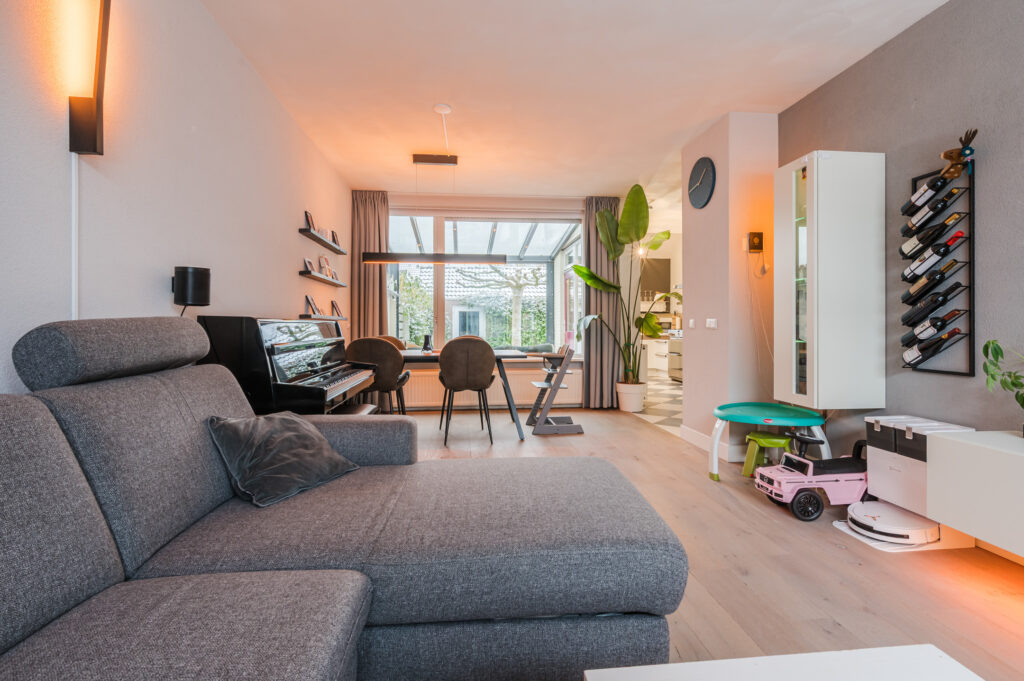 De ruime woonkamer profiteert van grote raampartijen aan zowel de voor- als achterzijde, wat zorgt voor veel natuurlijk licht. Aan de achterzijde is de keuken gesitueerd in de uitbouw, waardoor de woonkamer extra ruim aanvoelt. De keuken in hoekopstelling is uitgerust met diverse kasten, laden en inbouwapparatuur, waaronder een vaatwasser, oven met gasfornuis, afzuigkap en een Amerikaanse koelkast/vriezer. Vanuit de keuken is er directe toegang tot de achtertuin.