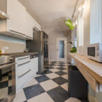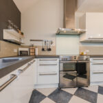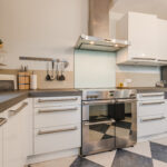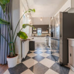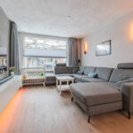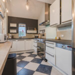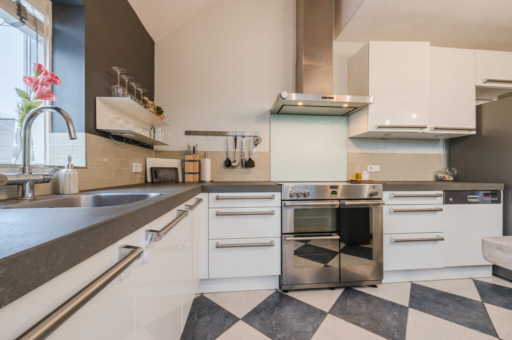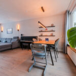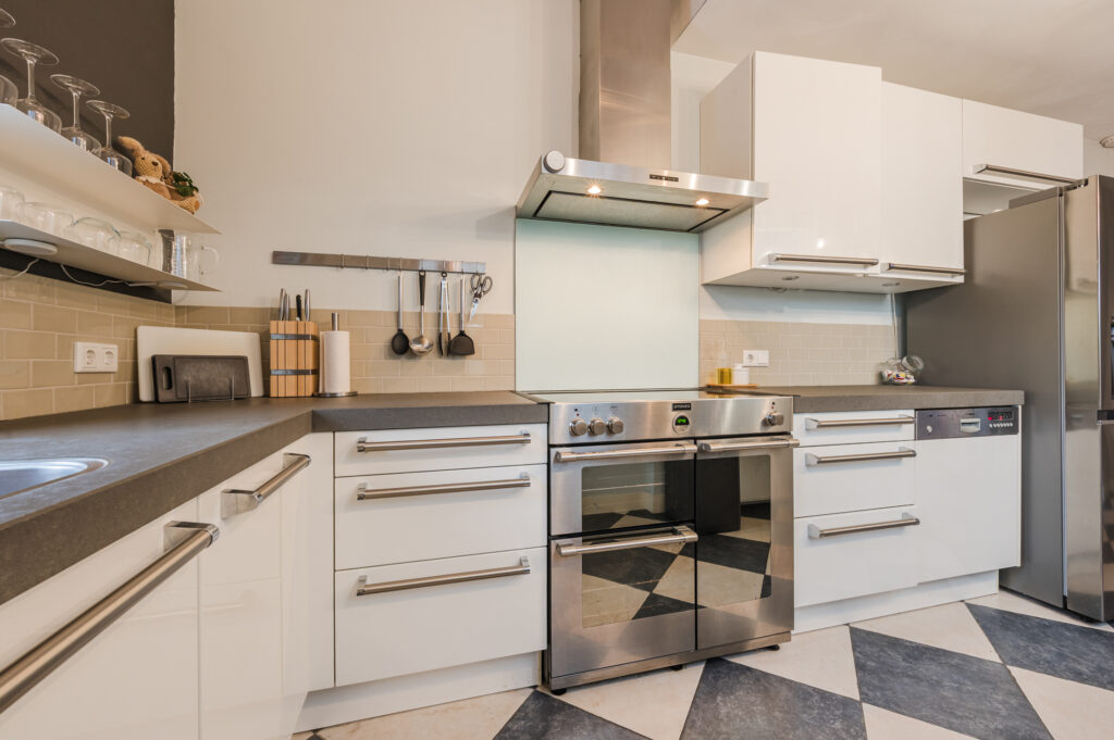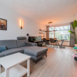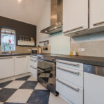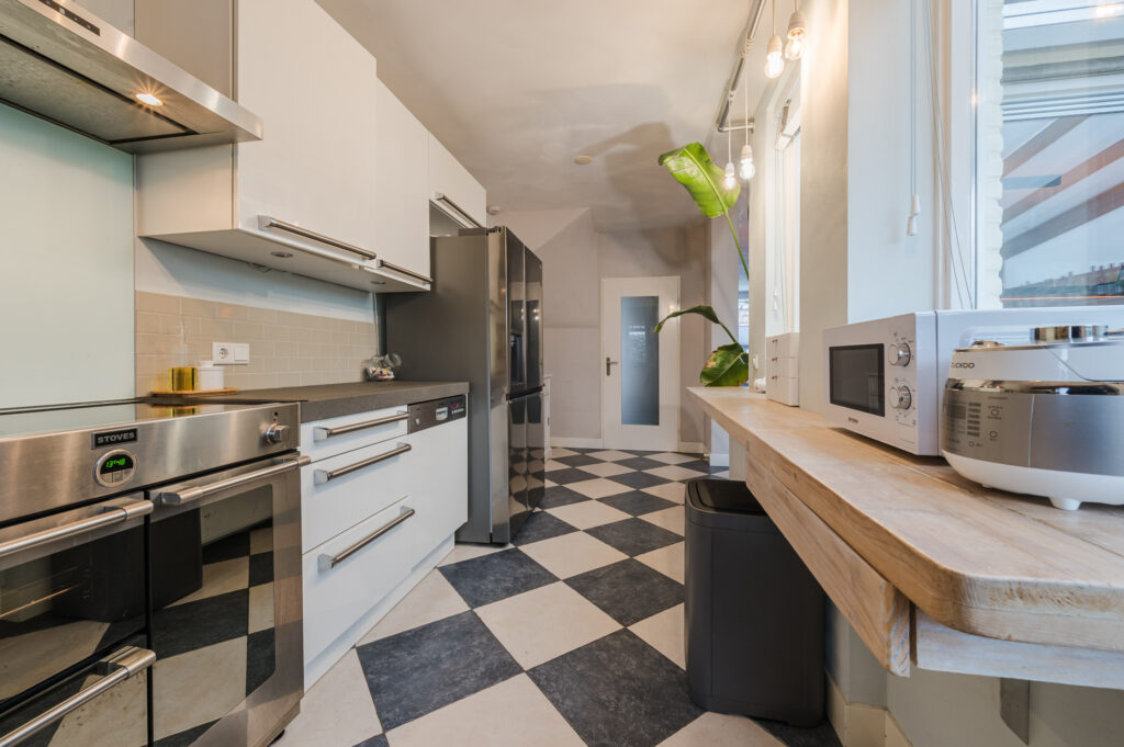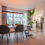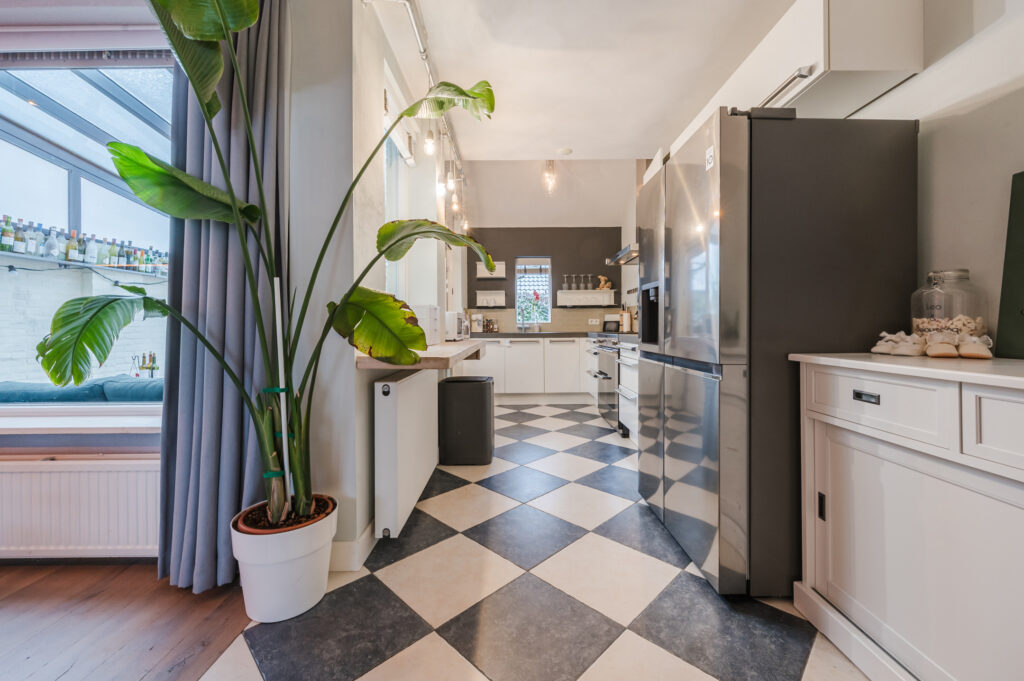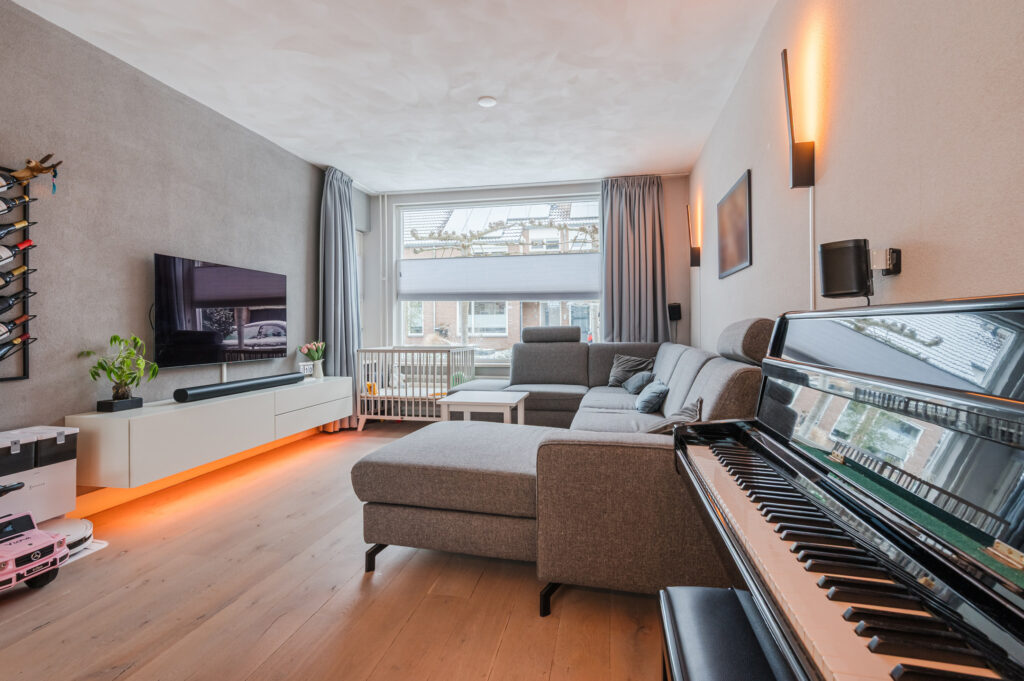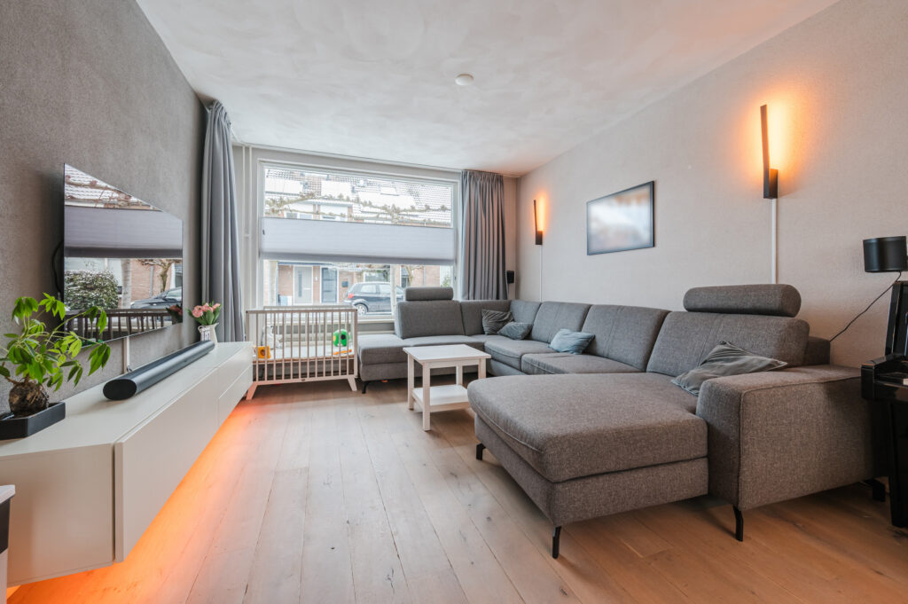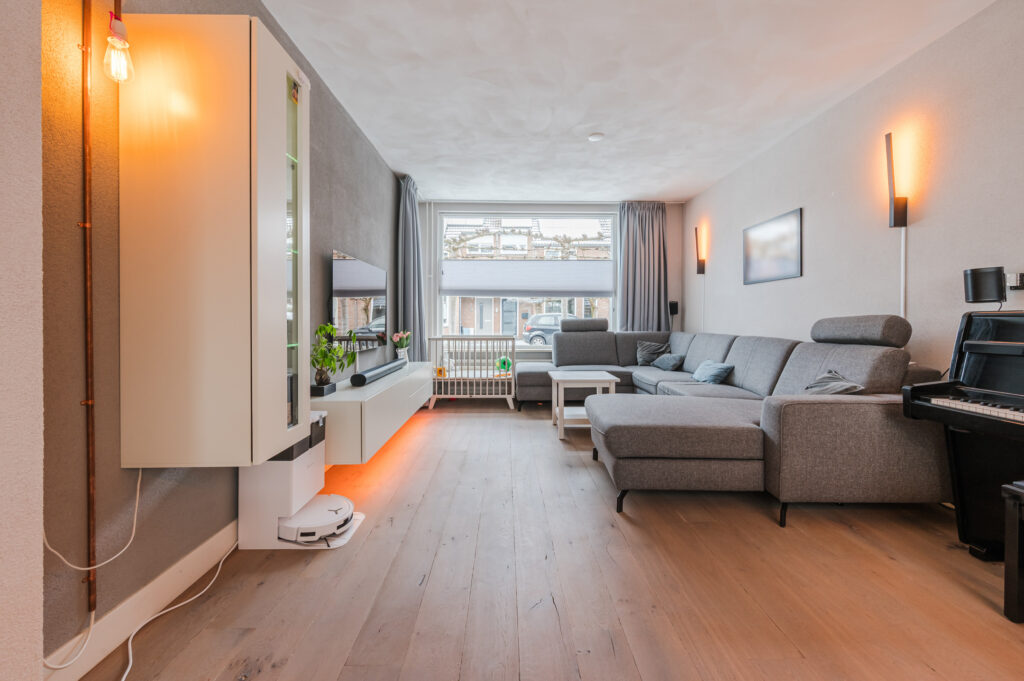 De ruime woonkamer profiteert van grote raampartijen aan zowel de voor- als achterzijde, wat zorgt voor veel natuurlijk licht. Aan de achterzijde is de keuken gesitueerd in de uitbouw, waardoor de woonkamer extra ruim aanvoelt. De keuken in hoekopstelling is uitgerust met diverse kasten, laden en inbouwapparatuur, waaronder een vaatwasser, oven met gasfornuis, afzuigkap en een Amerikaanse koelkast/vriezer. Vanuit de keuken is er directe toegang tot de achtertuin.