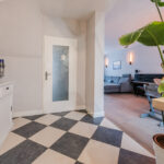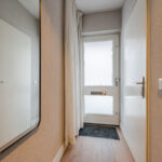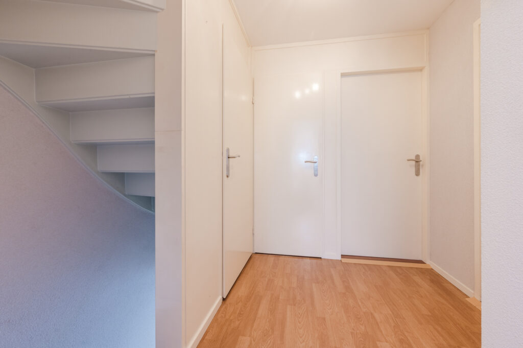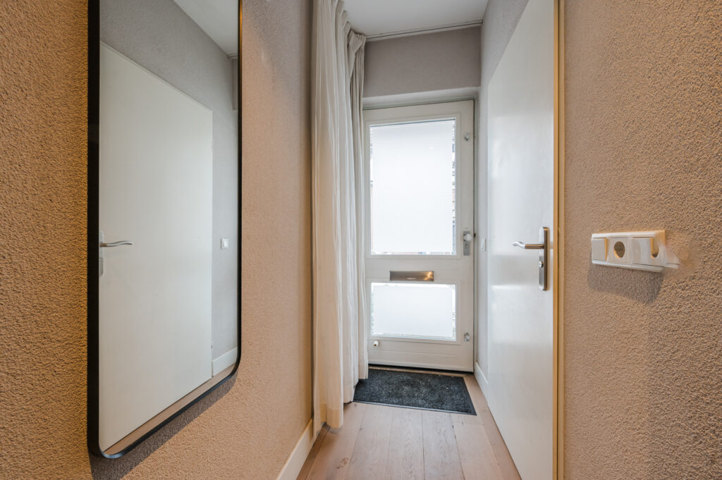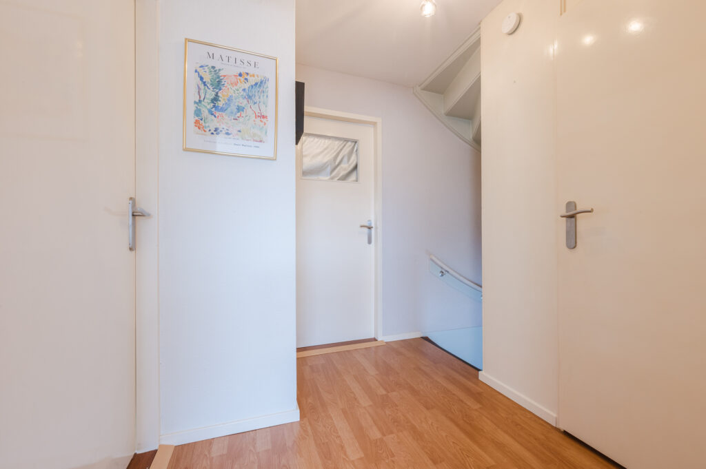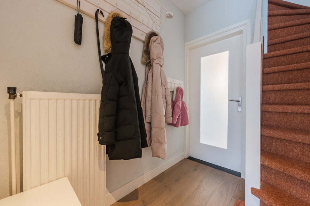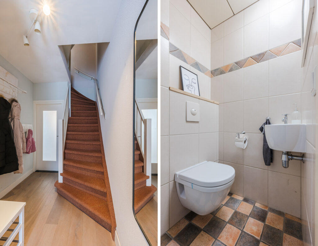 De fraai aangelegde, onderhoudsvriendelijke voortuin zorgt voor een verzorgde eerste indruk en biedt, wanneer de bomen in bloei staan, veel privacy. Via de overdekte entree komt u binnen in de hal met een nette houten vloer die is doorgelegd naar de woonkamer. De toiletruimte is modern afgewerkt en voorzien van een wandcloset en fonteintje.
