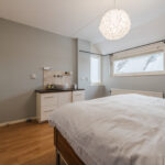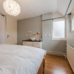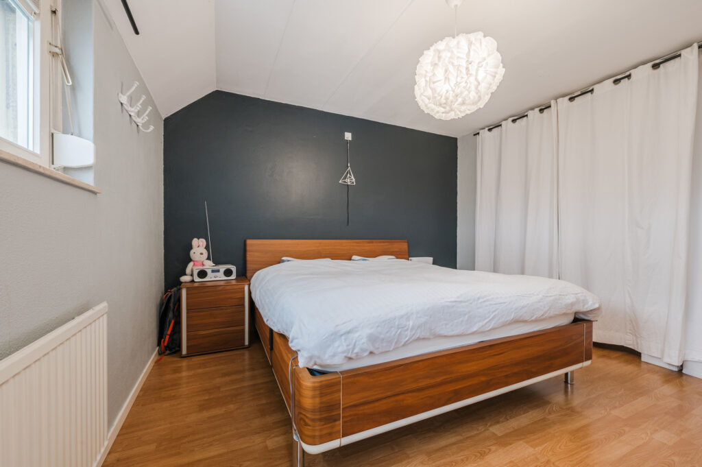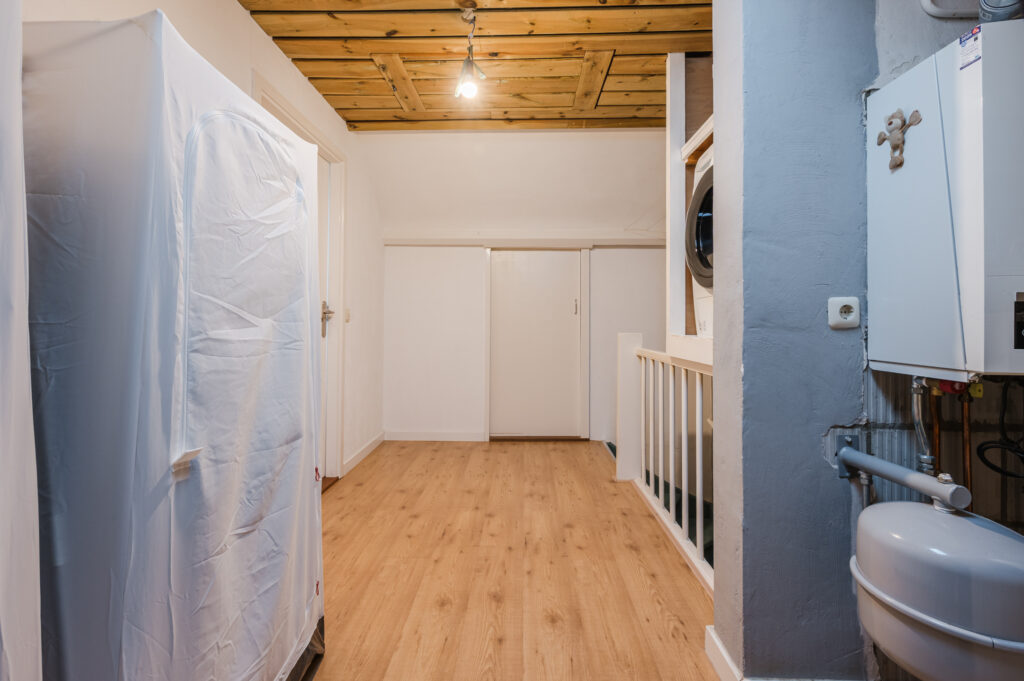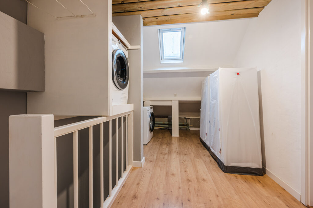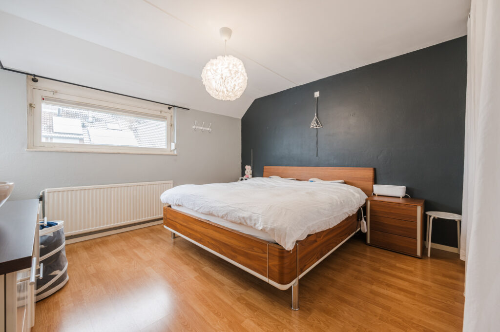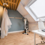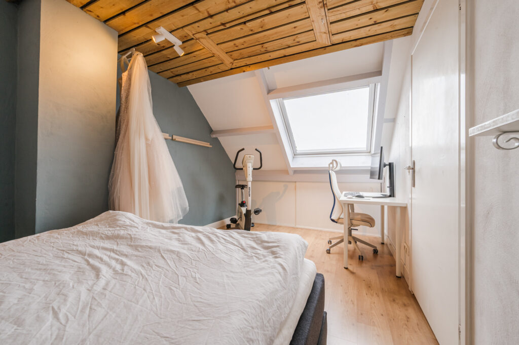 Via een vaste trap bereikt u de tweede verdieping met een royale voorzolder en de vierde slaapkamer. Ook hier ligt dezelfde laminaatvloer als op de eerste verdieping. Op de voorzolder bevinden zich de cv-installatie en de aansluitingen voor was- en droogapparatuur. Dankzij de knieschotten onder de kapschuiten is er volop bergruimte. De slaapkamer is voorzien van een groot dakvenster.