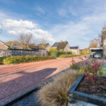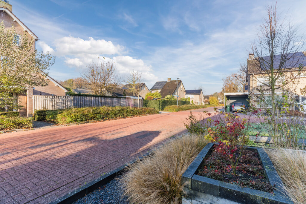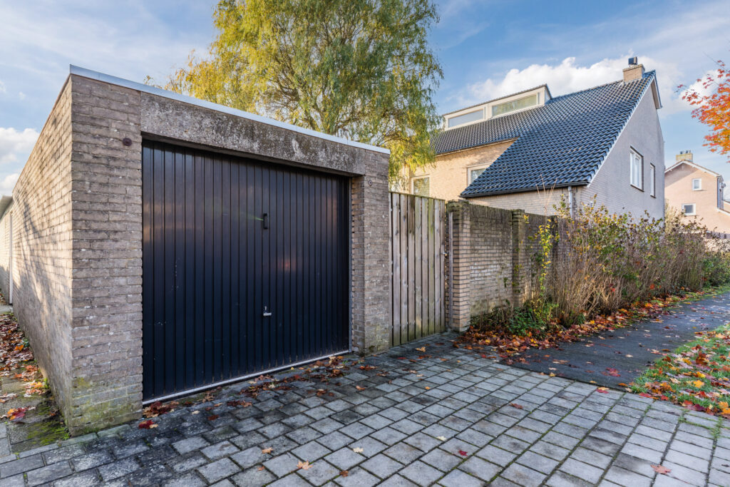 De keurig aangelegde voortuin zorgt voor een fraai aanzicht. De tuin is aangelegd met diverse plantenborders met vaste beplanting en sierbestrating. Aan de zijkant van de woning bevindt zich de garage met een stalen kanteldeur.