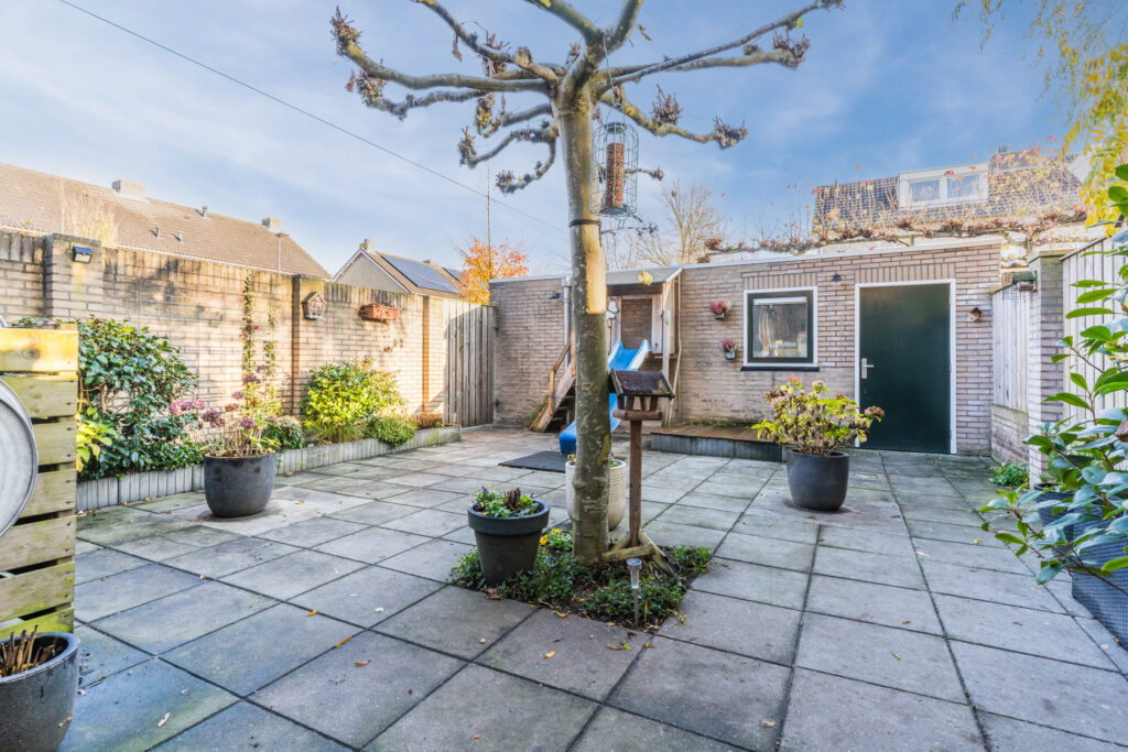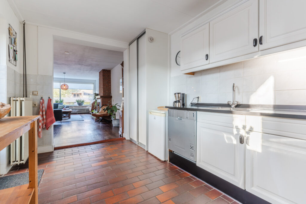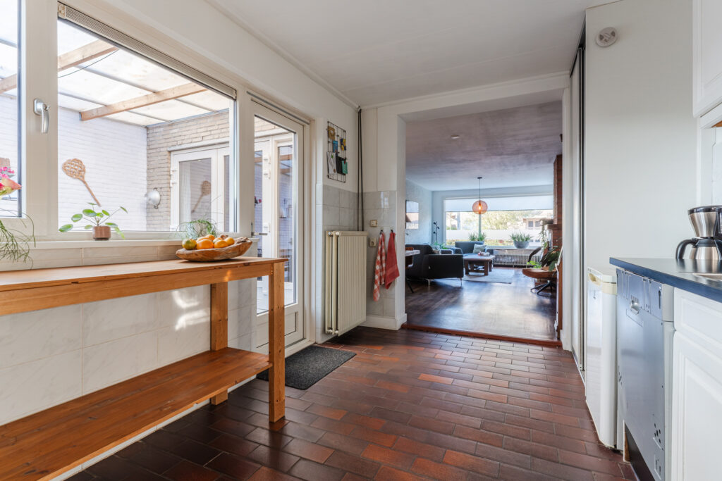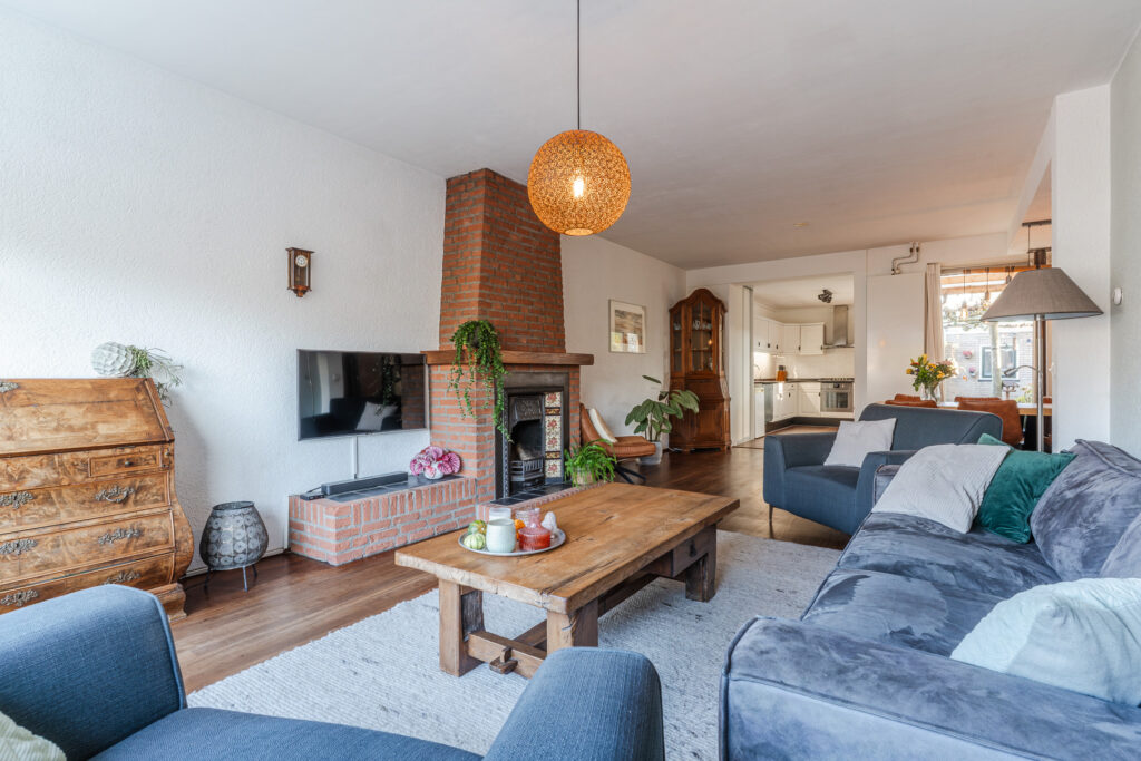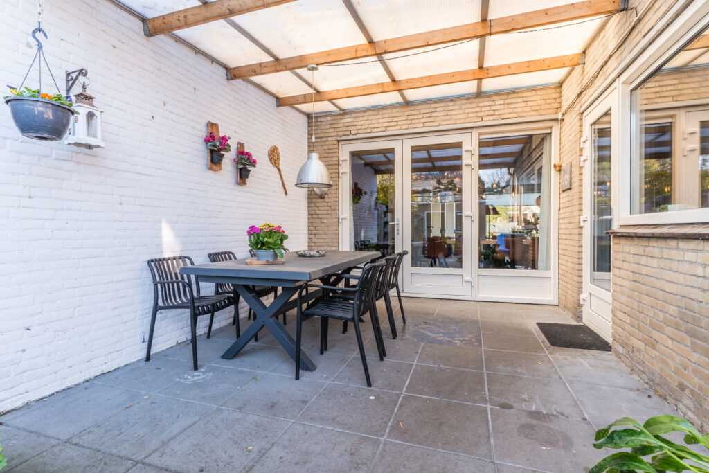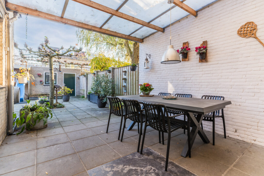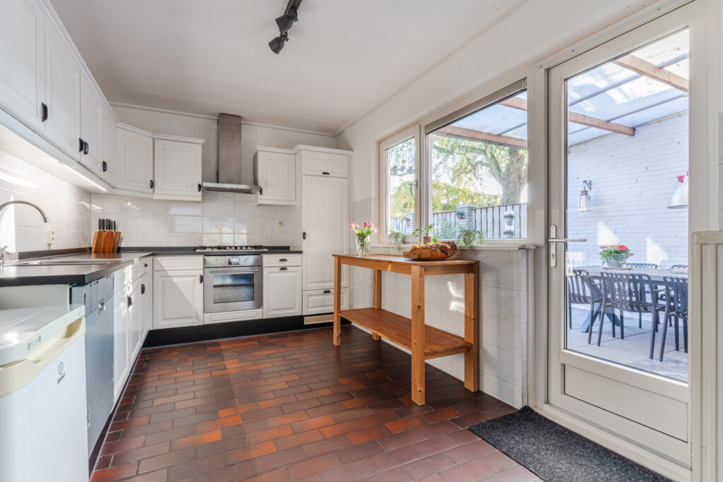 Entree van de woning met ontvangsthal. De hal is voorzien van een garderobehoek en toiletruimte met wandcloset en fonteintje. Op de vloer ligt een tegelvloer welke is doorgelegd tot in de toiletruimte. Vanuit de hal bereikt u de royale L-vormige woonkamer van circa 44 m2 waar verschillende indelingsmanieren mogelijk zijn. Op de vloer ligt een nette houten vloer en deze geeft samen met de openhaard een warme sfeer aan de woonkamer. De grote raampartijen aan zowel de voor- als achterzijde bieden een prettig lichtinval. De half open keuken is aansluitend bereikbaar vanuit de woonkamer. Dit keukenmeubel in hoekopstelling is voorzien van diverse onder- en bovenkasten, laden en apparatuur: koelkast, vaatwasser, oven, gaskookplaat en afzuigkap. Zowel vanuit de keuken als middels dubbele openslaande deuren vanuit de woonkamer komt u bij het (overdekte) terras in de achtertuin. Deze fraaie overkapping maakt het mogelijk dat u al vroeg in het jaar kunt genieten van de eerste zonnestralen of de zomeravonden hier kunt verlengen. De achtertuin is gelegen op het noordoosten en vanwege de lengte van circa 15 meter biedt het altijd een plek in de zon gedurende de dag. De tuin is keurig aangelegd met diverse plantenborders en achterin de tuin bevindt zich de vrijstaande garage met zowel een kanteldeur naar de straat als een loopdeur naar de tuin. Aan de zijkant van de woning is er ook nog een poort voor de achterom.