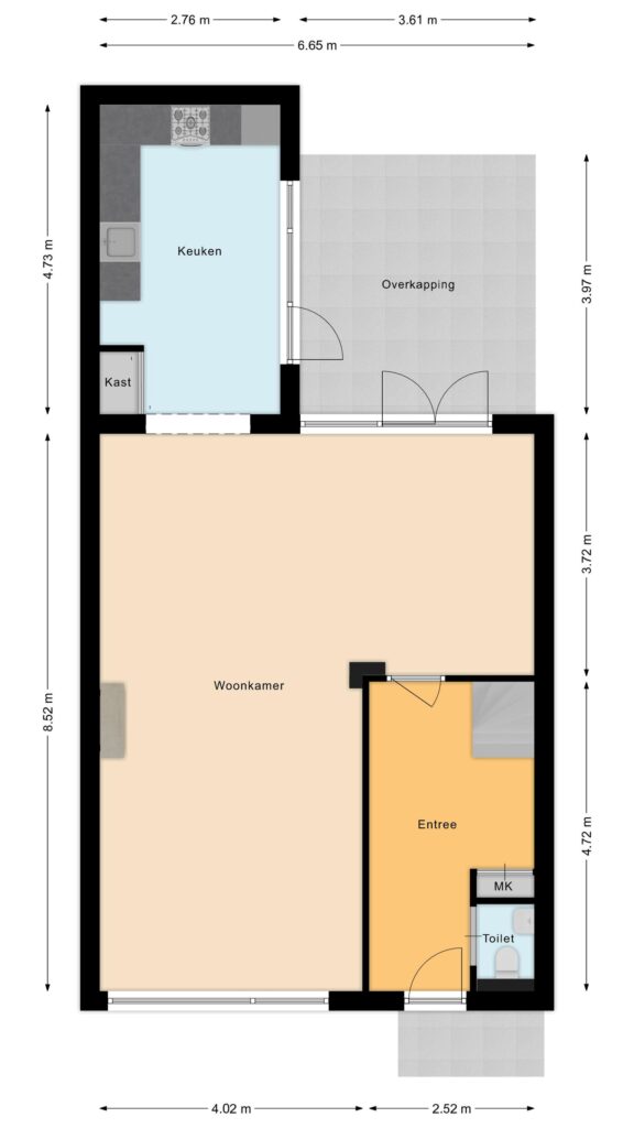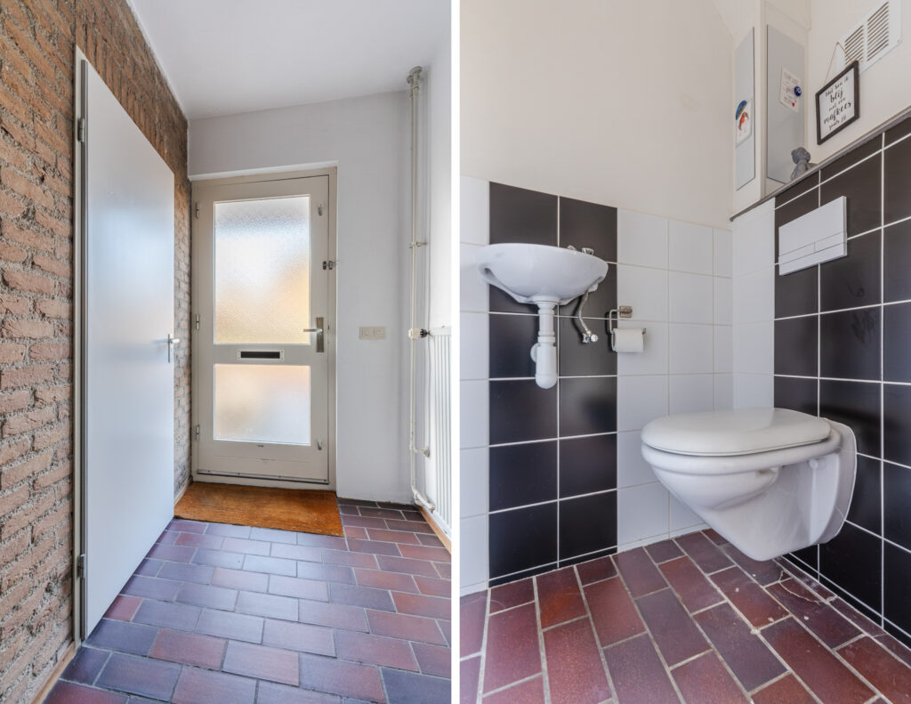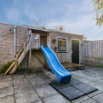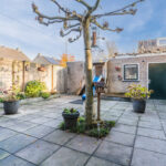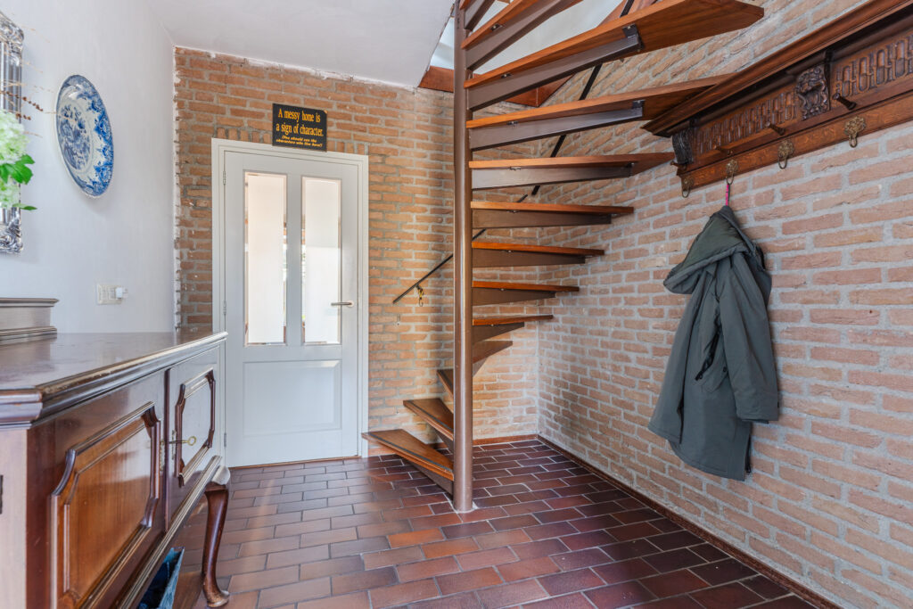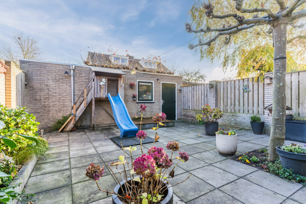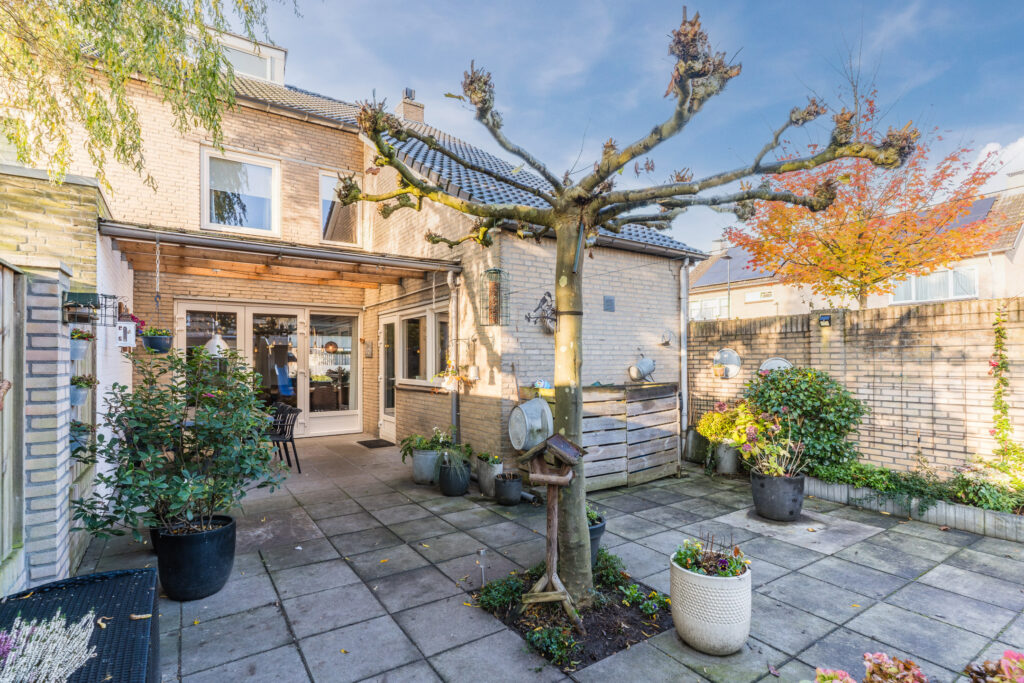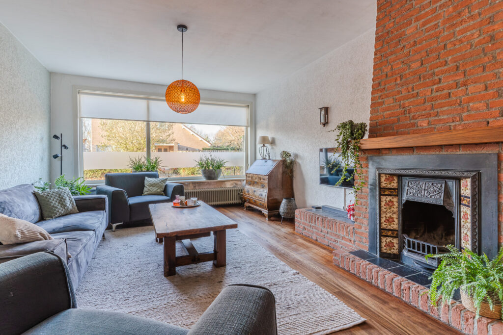 Entree van de woning met ontvangsthal. De hal is voorzien van een garderobehoek en toiletruimte met wandcloset en fonteintje. Op de vloer ligt een tegelvloer welke is doorgelegd tot in de toiletruimte. Vanuit de hal bereikt u de royale L-vormige woonkamer van circa 44 m2 waar verschillende indelingsmanieren mogelijk zijn. Op de vloer ligt een nette houten vloer en deze geeft samen met de openhaard een warme sfeer aan de woonkamer. De grote raampartijen aan zowel de voor- als achterzijde bieden een prettig lichtinval. De half open keuken is aansluitend bereikbaar vanuit de woonkamer. Dit keukenmeubel in hoekopstelling is voorzien van diverse onder- en bovenkasten, laden en apparatuur: koelkast, vaatwasser, oven, gaskookplaat en afzuigkap. Zowel vanuit de keuken als middels dubbele openslaande deuren vanuit de woonkamer komt u bij het (overdekte) terras in de achtertuin. Deze fraaie overkapping maakt het mogelijk dat u al vroeg in het jaar kunt genieten van de eerste zonnestralen of de zomeravonden hier kunt verlengen. De achtertuin is gelegen op het noordoosten en vanwege de lengte van circa 15 meter biedt het altijd een plek in de zon gedurende de dag. De tuin is keurig aangelegd met diverse plantenborders en achterin de tuin bevindt zich de vrijstaande garage met zowel een kanteldeur naar de straat als een loopdeur naar de tuin. Aan de zijkant van de woning is er ook nog een poort voor de achterom.