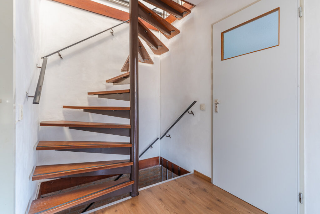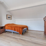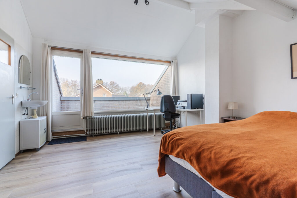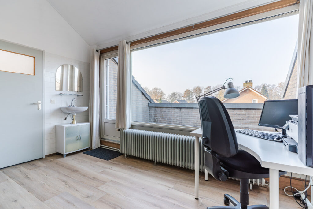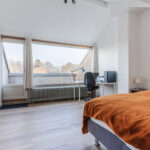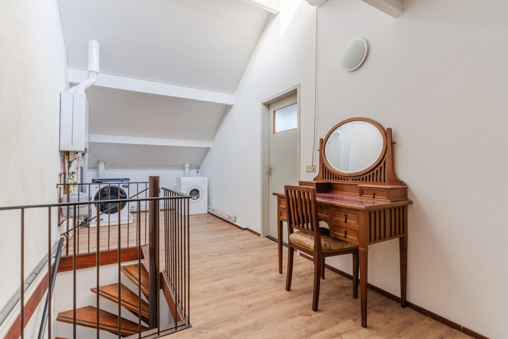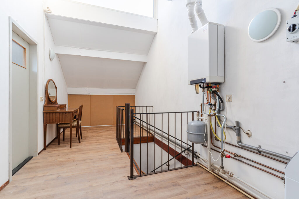 Middels een vaste trap te bereiken voorzolder met de opstelling van de Cv-installatie en de aansluitingen voor was- en droogapparatuur. Aansluitend is er een royale 4de (slaap)of hobbykamer te bereiken met een wastafel en een fijn dakterras op het zuidwesten. De ideale plek om hier rustig van de zon te kunnen genieten. Het raam van deze verdieping naar het zonneterras toe is voorzien van een zonnescreen. Over de hele verdieping zijn onder de kapschuiten praktische knieschotten gerealiseerd voor extra bergruimte.
